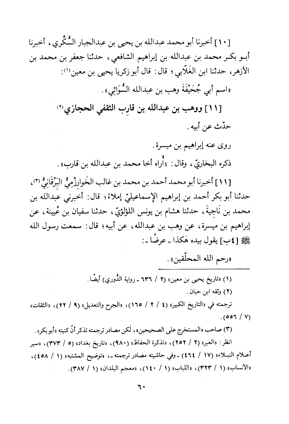 10 - أخبرنَا أَبُو مُحَمَّد عبد الله بن يحيى بن عبد الْجَبَّار السكرِي أخبرنَا أَبُو بكر مُحَمَّد بن عبد الله بن إِبْرَاهِيم الشَّافِعِي حَدثنَا جَعْفَر بن مُحَمَّد بن الْأَزْهَر حَدثنَا ابْن الْغلابِي قَالَ قَالَ أَبُو زَكَرِيَّا يحيى بن معِين اسْم أبي جُحَيْفَة وهب بن عبد الله السوَائِي