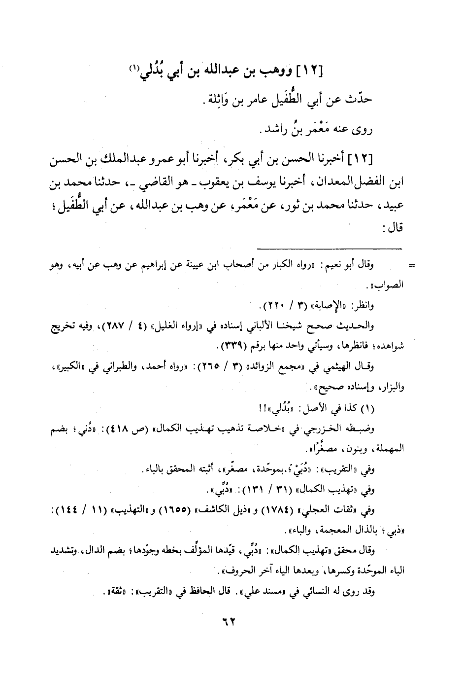(12) ووهب بن عبد الله بن أبي بدلي حدث عَن أبي الطُّفَيْل عَامر بن وَاثِلَة روى عَنهُ معمر بن