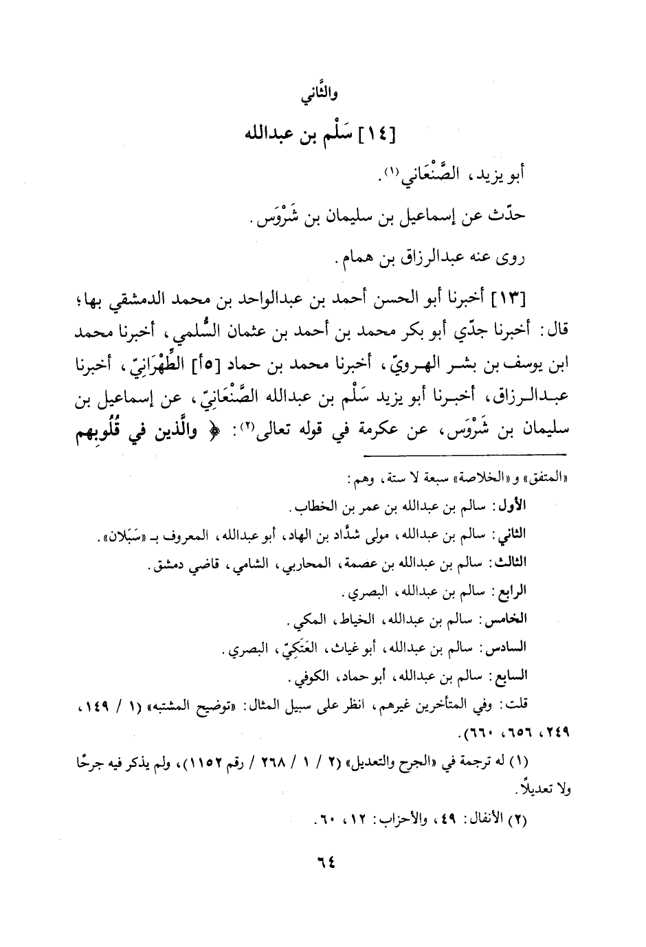 13 - أخبرنَا أَبُو الْحسن أَحْمد بن عبد الْوَاحِد بن مُحَمَّد الدِّمَشْقِي بهَا قَالَ أخبرنَا جدي أَبُو بكر مُحَمَّد بن أَحْمد بن عُثْمَان السّلمِيّ أخبرنَا مُحَمَّد ابْن يُوسُف بن بشر الْهَرَوِيّ أخبرنَا مُحَمَّد بن حَمَّاد (5 أ) الطهراني أخبرنَا عبد الرَّزَّاق أخبرنَا أَبُو يزِيد سلم بن عبد الله الصَّنْعَانِيّ عَن إِسْمَاعِيل بن سُلَيْمَان بن شروس عَن عِكْرِمَة فِي قَوْله تَعَالَى {وَالَّذين فِي قُلُوبهم مرض} قَالَ الزِّنَا