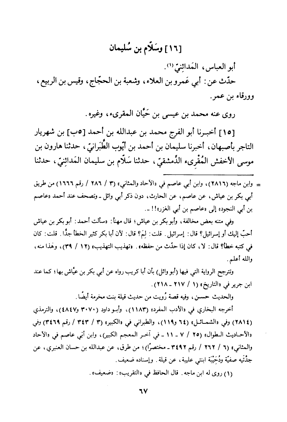 (16) وَسَلام بن سُلَيْمَان أَبُو الْعَبَّاس الْمَدَائِنِي حدث عَن أبي عَمْرو بن الْعَلَاء وَشعْبَة بن الْحجَّاج وَقيس بن الرّبيع
