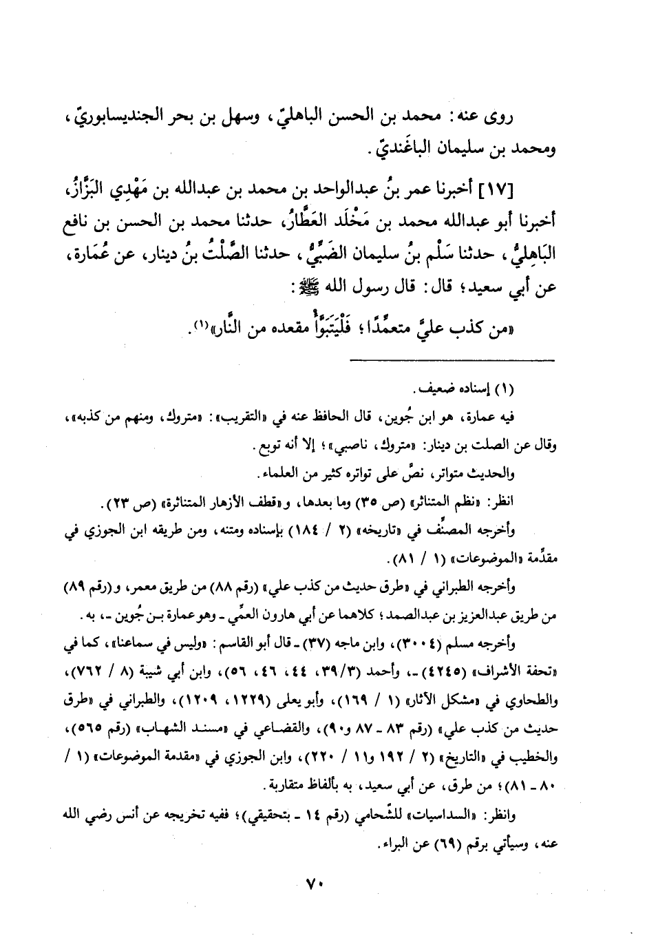 17 - أخبرنَا عمر بن عبد الْوَاحِد بن مُحَمَّد بن عبد الله بن مهْدي الْبَزَّاز أخبرنَا أَبُو عبد الله مُحَمَّد بن مخلد الْعَطَّار حَدثنَا مُحَمَّد بن الْحسن بن نَافِع الْبَاهِلِيّ حَدثنَا سلم بن سُلَيْمَان الضَّبِّيّ حَدثنَا الصَّلْت بن دِينَار عَن عمَارَة عَن أبي سعيد قَالَ قَالَ رَسُول الله صلى الله عَلَيْهِ وَسلم من كذب عَليّ مُتَعَمدا فَليَتَبَوَّأ مَقْعَده من النَّار