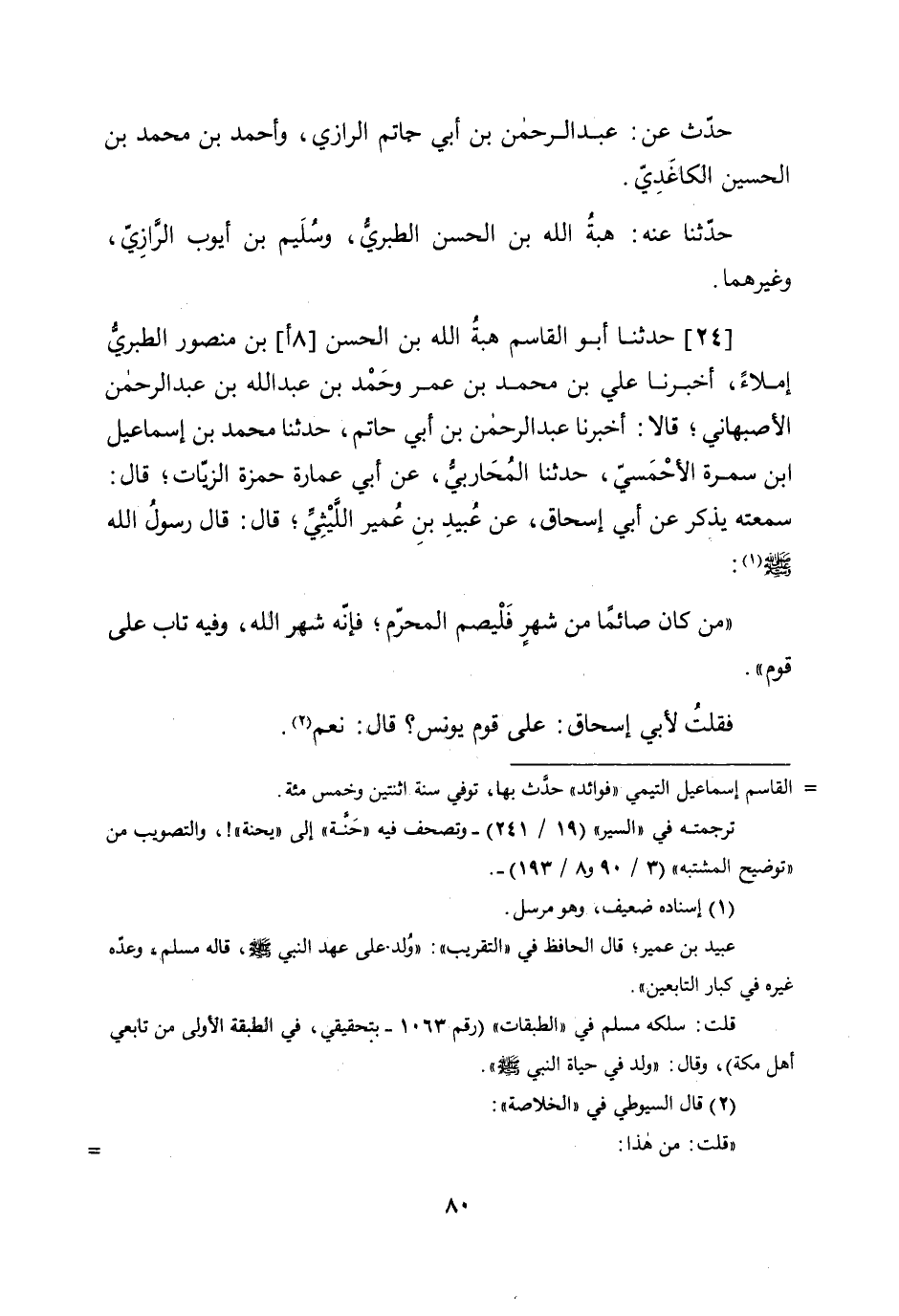 24 - حَدثنَا أَبُو الْقَاسِم هبة الله بن الْحسن (8 أ) بن مَنْصُور الطَّبَرِيّ إملاء أخبرنَا عَليّ بن مُحَمَّد بن عمر وَحمد بن عبد الله بن عبد الرَّحْمَن الْأَصْبَهَانِيّ قَالَا أخبرنَا عبد الرَّحْمَن بن أبي حَاتِم حَدثنَا مُحَمَّد بن إِسْمَاعِيل ابْن سَمُرَة الأحمسي حَدثنَا الْمحَاربي عَن أبي عمَارَة حَمْزَة الزيات قَالَ سمعته يذكر عَن أبي إِسْحَاق عَن عبيد بن عُمَيْر اللَّيْثِيّ قَالَ قَالَ رَسُول الله صلى الله عَلَيْهِ وَسلم من كَانَ صَائِما من شهر فليصم الْمحرم فَإِنَّهُ شهر الله وَفِيه تَابَ على قوم فَقلت لأبي إِسْحَاق على قوم يُونُس قَالَ نعم
