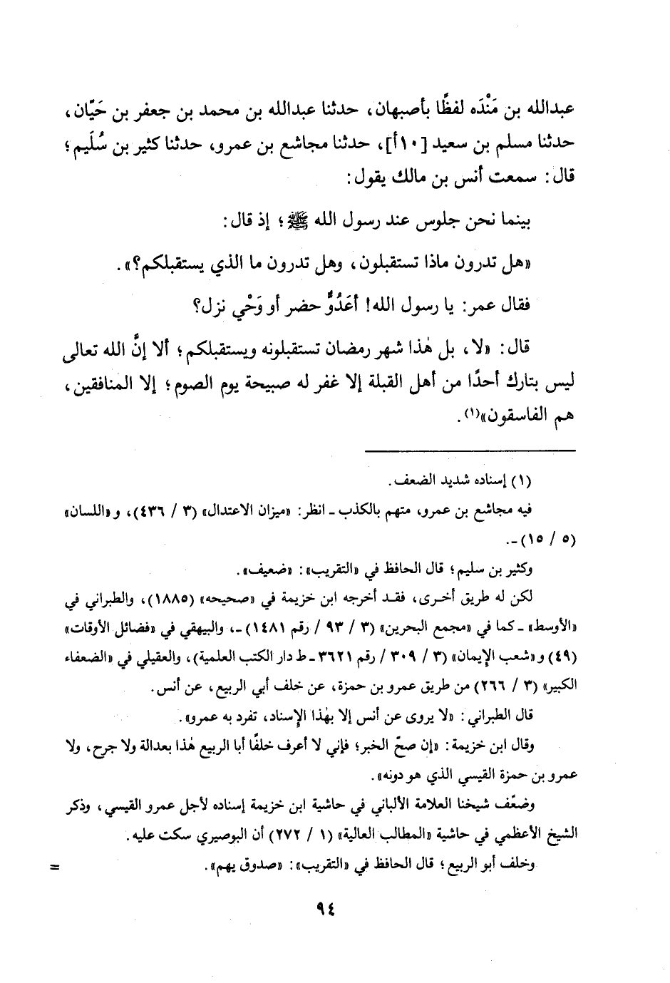 عبد الله بن مَنْدَه لفظا بأصبهان حَدثنَا عبد الله بن مُحَمَّد بن جَعْفَر بن حَيَّان حَدثنَا مُسلم بن سعيد (10 أ) حَدثنَا مجاشع بن عَمْرو حَدثنَا كثير بن سليم قَالَ سَمِعت أنس بن مَالك يَقُول بَيْنَمَا نَحن جُلُوس عِنْد رَسُول الله صلى الله عَلَيْهِ وَسلم إِذْ قَالَ هَل تَدْرُونَ مَاذَا تستقبلون وَهل تَدْرُونَ مَا الَّذِي يستقبلكم فَقَالَ عمر يَا رَسُول الله أعدو حضر أَو وَحي نزل قَالَ لَا بل هَذَا شهر رَمَضَان تستقبلونه ويستقبلكم أَلا إِن الله تَعَالَى لَيْسَ بتارك أحدا من أهل الْقبْلَة إِلَّا غفر لَهُ صَبِيحَة يَوْم الصَّوْم إِلَّا الْمُنَافِقين هم الْفَاسِقُونَ