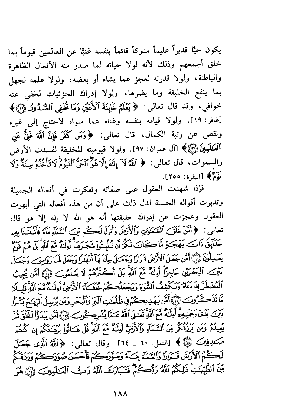 فإذا شهدت العقول على صفاته وتفكرت في أفعاله الجميلة وتدبرت أقواله الحسنة لدل ذلك على أن من هذه أفعاله التي أبهرت العقول وعجزت عن إدراك حقيقتها أنه هو الله لا إله إلا هو قال تعالى: {أَمَّنْ خَلَقَ السَّمَاوَاتِ وَالْأَرْضَ وَأَنْزَلَ لَكُمْ مِنَ السَّمَاءِ مَاءً فَأَنْبَتْنَا بِهِ حَدَائِقَ ذَاتَ بَهْجَةٍ مَا كَانَ لَكُمْ أَنْ تُنْبِتُوا شَجَرَهَا أَإِلَهٌ مَعَ اللَّهِ بَلْ هُمْ قَوْمٌ يَعْدِلُونَ أَمَّنْ جَعَلَ الْأَرْضَ قَرَاراً وَجَعَلَ خِلالَهَا أَنْهَاراً وَجَعَلَ لَهَا رَوَاسِيَ وَجَعَلَ بَيْنَ الْبَحْرَيْنِ حَاجِزاً أَإِلَهٌ مَعَ اللَّهِ بَلْ أَكْثَرُهُمْ لا يَعْلَمُونَ أَمَّنْ يُجِيبُ الْمُضْطَرَّ إِذَا دَعَاهُ وَيَكْشِفُ السُّوءَ وَيَجْعَلُكُمْ خُلَفَاءَ الْأَرْضِ أَإِلَهٌ مَعَ اللَّهِ قَلِيلاً مَا تَذَكَّرُونَ أَمَّنْ يَهْدِيكُمْ فِي ظُلُمَاتِ الْبَرِّ وَالْبَحْرِ وَمَنْ يُرْسِلُ الرِّيَاحَ بُشْراً بَيْنَ يَدَيْ رَحْمَتِهِ أَإِلَهٌ مَعَ اللَّهِ تَعَالَى اللَّهُ عَمَّا يُشْرِكُونَ أَمَّنْ يَبْدأُ الْخَلْقَ ثُمَّ يُعِيدُهُ وَمَنْ يَرْزُقُكُمْ مِنَ السَّمَاءِ وَالْأَرْضِ أَإِلَهٌ مَعَ اللَّهِ قُلْ هَاتُوا بُرْهَانَكُمْ إِنْ كُنْتُمْ صَادِقِينَ} . [النمل: 60- 64] . وقال تعالى: {اللَّهُ الَّذِي جَعَلَ لَكُمُ الْأَرْضَ قَرَاراً وَالسَّمَاءَ بِنَاءً وَصَوَّرَكُمْ فَأَحْسَنَ صُوَرَكُمْ وَرَزَقَكُمْ مِنَ الطَّيِّبَاتِ ذَلِكُمُ اللَّهُ رَبُّكُمْ فَتَبَارَكَ اللَّهُ رَبُّ الْعَالَمِينَ, هُوَ