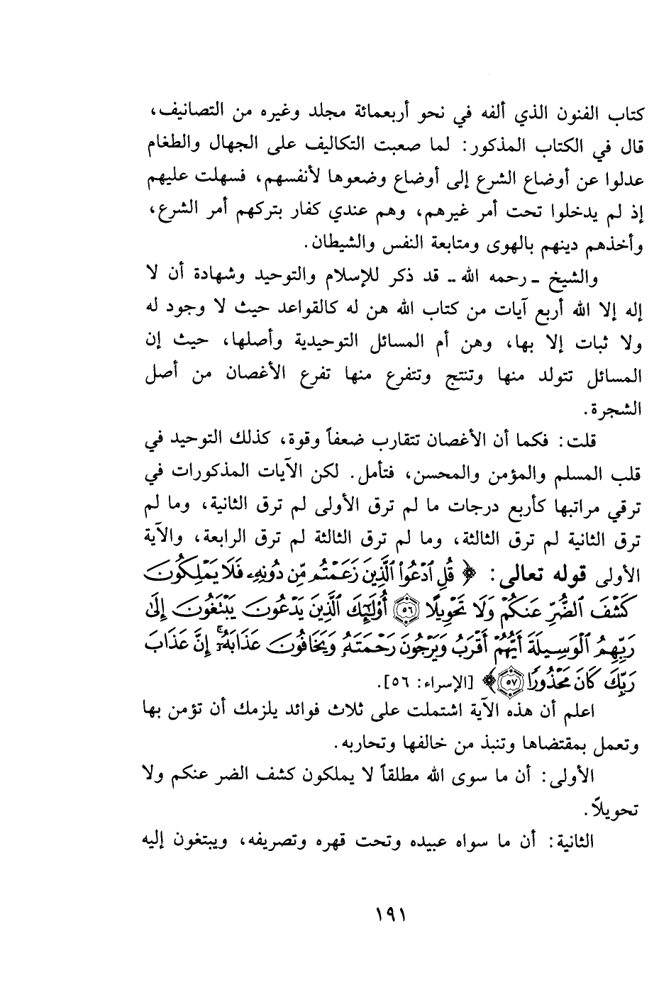 قلت: فكما أن الأغصان تتقارب ضعفاً وقوة، كذلك التوحيد في قلب المسلم والمؤمن والمحسن، فتأمل. لكن الآيات المذكورات في ترقي مراتبها كأربع درجات ما لم ترق الأولى لم ترق الثانية، وما لم ترق الثانية لم ترق الثالثة، وما لم ترق الثالثة لم ترق الرابعة، والآية الأولى قوله تعالى: {قُلِ ادْعُوا الَّذِينَ زَعَمْتُمْ مِنْ دُونِهِ فَلا يَمْلِكُونَ كَشْفَ الضُّرِّ عَنْكُمْ وَلا تَحْوِيلاً أُولَئِكَ الَّذِينَ يَدْعُونَ يَبْتَغُونَ إِلَى رَبِّهِمُ الْوَسِيلَةَ أَيُّهُمْ أَقْرَبُ وَيَرْجُونَ رَحْمَتَهُ وَيَخَافُونَ عَذَابَهُ إِنَّ عَذَابَ رَبِّكَ كَانَ مَحْذُوراً} . [الإسراء: 56- 57] .
