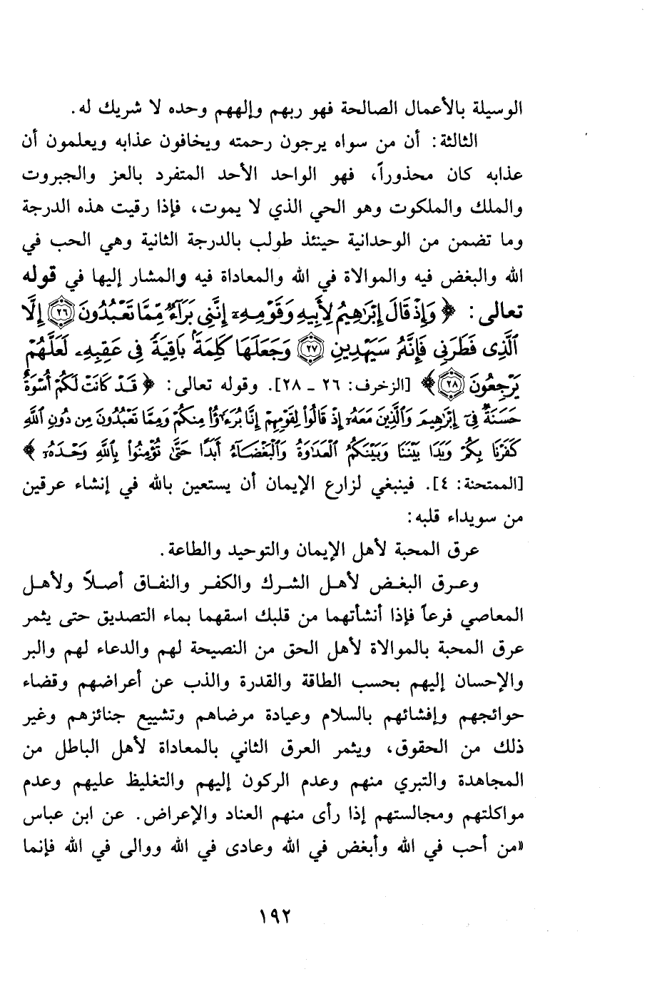 الثالثة: أن من سواه يرجون رحمته ويخافون عذابه ويعلمون أن عذابه كان محذوراً، فهو الواحد الأحد المتفرد بالعز والجبروت والملك والملكوت وهو الحي الذي لا يموت، فإذا رفيت هذه الدرجة وما تضمن من الوحدانية حينئذ طولب بالدرجة الثانية الحب في الله والبغض فيه والموالاة في الله والمعاداة فيه والمشار إليه في قوله تعالى: {وَإِذْ قَالَ إِبْرَاهِيمُ لِأَبِيهِ وَقَوْمِهِ إِنَّنِي بَرَاءٌ مِمَّا تَعْبُدُونَ إِلَّا الَّذِي فَطَرَنِي فَإِنَّهُ سَيَهْدِينِ وَجَعَلَهَا كَلِمَةً بَاقِيَةً فِي عَقِبِهِ لَعَلَّهُمْ يَرْجِعُونَ} . [الزخرف: 26- 28] . وقوله تعالى: {قَدْ كَانَتْ لَكُمْ أُسْوَةٌ حَسَنَةٌ فِي إِبْرَاهِيمَ وَالَّذِينَ مَعَهُ إِذْ قَالُوا لِقَوْمِهِمْ إِنَّا بُرَآءُ مِنْكُمْ وَمِمَّا تَعْبُدُونَ مِنْ دُونِ اللَّهِ كَفَرْنَا بِكُمْ وَبَدَا بَيْنَنَا وَبَيْنَكُمُ الْعَدَاوَةُ وَالْبَغْضَاءُ أَبَداً حَتَّى تُؤْمِنُوا بِاللَّهِ وَحْدَهُ} . [الممتحنة: 4] . فينبغي لزارع الإيمان أن يستعين بالله في إنشاء عرقين من سويداء قلبه: