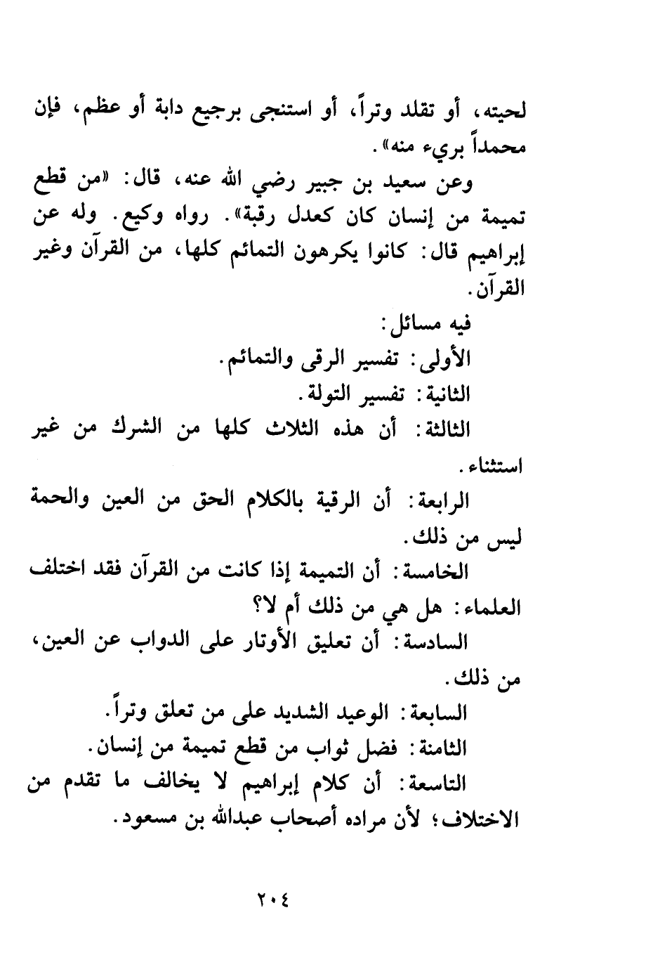 وعن سعيد بن جبير رضي الله عنه، قال: "من قطع تميمة من إنسان كان كعدل رقبة" رواه وكيع. وله عن إبراهيم قال: كانوا يكرهون التمائم كلها، من القرآن وغير القرآن.