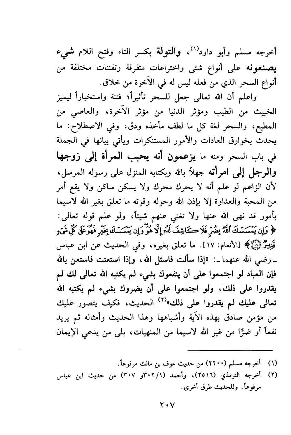 واعلم أن الله جعل للسحر تأثيراً؛ فتنة واستخباراً ليميز الخبيث من الطيب ومؤثر الدنيا من مؤثر الآخرة، والعاصي من المطيع، والسحر لغة: كل ما لطف مأخذه ودق، وفي الاصطلاح: ما يحدث بخوارق العادات والأمور المستنكرات ويأتي بيانها في الجملة في باب السحر ومنه ما يزعمون أنه يحبب المرأة إلى زوجها والرجل إلى امرأته جهلاً بالله وبكتابه المنزل على رسوله المرسل، لأن الزاعم لو علم أنه لا يحرك محرك ولا يسكن ساكن ولا يقع أمر من المحبة والعداوة إلا بإذن الله وحوله وقوته ما تعلق بغير الله لاسيما بأمور قد نهى الله عنها ولا تني عنهم شيئاً، ولو علم قوله تعالى: {وَإِنْ يَمْسَسْكَ اللَّهُ بِضُرٍّ فَلا كَاشِفَ لَهُ إِلَّا هُوَ وَإِنْ يَمْسَسْكَ بِخَيْرٍ فَهُوَ عَلَى كُلِّ شَيْءٍ قَدِيرٌ} . [الأنعام: 17] . ما تعلق بغيره، وفي الحديث عن ابن عباس -رضي الله عنهما-: "إذا سألت فاسأل الله، وإذا استعنت فاستعن بالله، فإن العباد لو اجتمعوا على أن ينفعوك بشيء لم يكتبه الله تعالى لك لم يقدروا على ذلك، ولو اجتمعوا على أن يضروك بشيء لم يكتبه الله تعالى عليك لم يقدروا على ذلك" 2 الحديث، فكيف يتصور عليك من مؤمن صادق بهذه الآية وأشباهها وهذا الحديث وأمثاله ثم يريد نفعاً أو ضراً من غير الله لاسيما من المنهيات، بلى من يدعي الإيمان