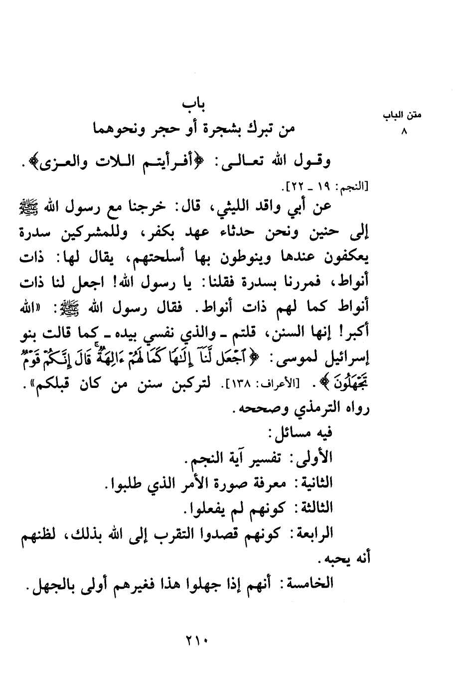 عن أبي واقد الليثي، قال: خرجنا مع رسول الله صلى الله عليه وسلم إلى حنين ونحن حدثاء عهد بكفر، وللمشركين سدرة يعكفون عندها وينوطون بها أسلحتهم، يقال لها: ذات أنواط، فمررنا بسدرة فقلنا: يا رسول الله! اجعل لنا ذات أنواط كما لهم ذات أنواط. فقال رسول الله صلى الله عليه وسلم: "الله أكبر! إنها السنن، قلتم -والذي نفسي بيده- كما قالت بنو إسرائيل لموسى: {اجْعَلْ لَنَا إِلَهاً كَمَا لَهُمْ آلِهَةٌ قَالَ إِنَّكُمْ قَوْمٌ تَجْهَلُونَ} [الأعراف: 138] . لتركبن سنن من كان قبلكم". رواه الترمذي وصححه.