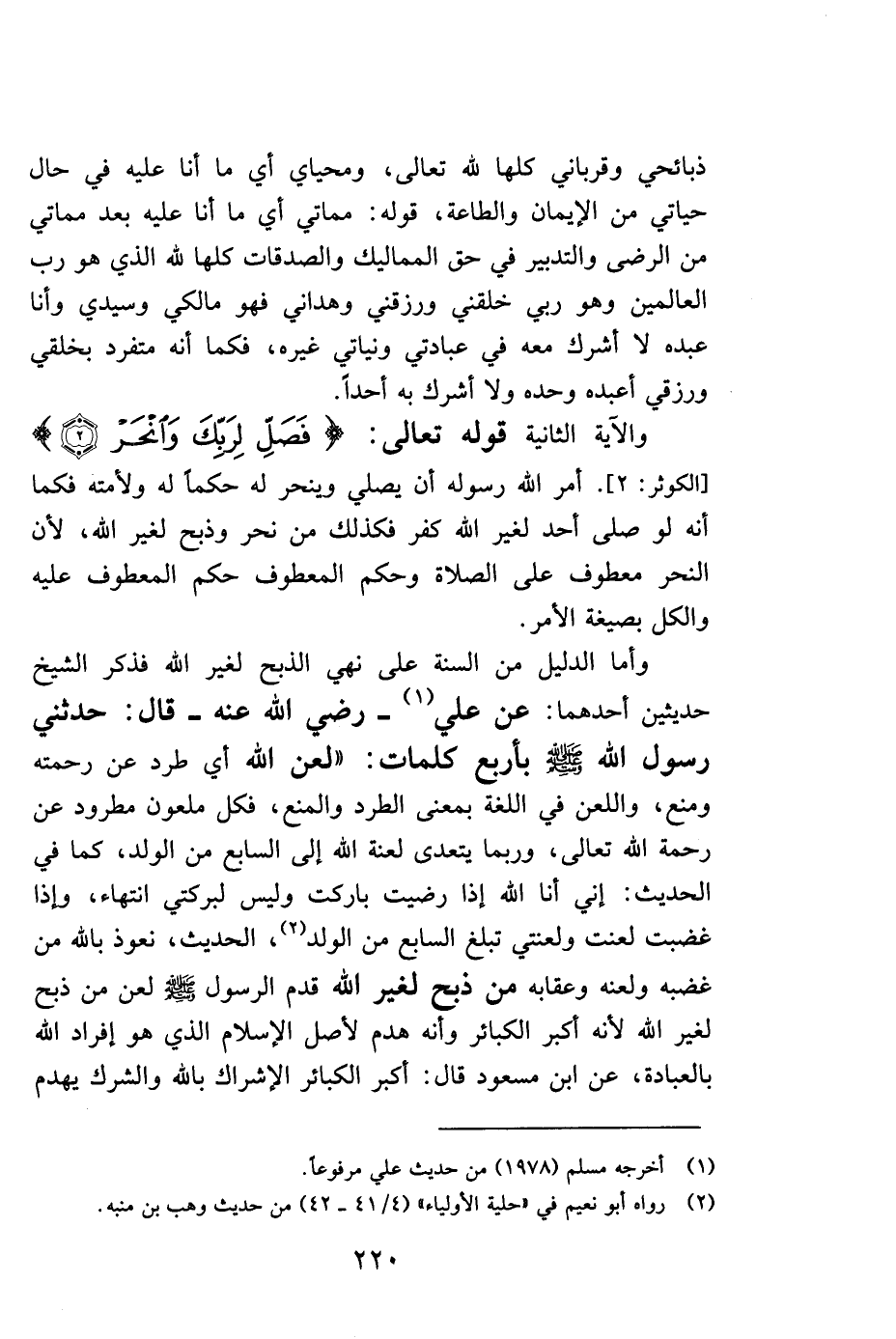 والآية الثانية قوله تعالى: {فَصَلِّ لِرَبِّكَ وَانْحَرْ} . [الكوثر: 2] أمر الله رسوله أن يصلي وينحر له حكماً له ولأمته فكما أنه لو صلى أحد لغير الله كفر فكذلك من نحر وذبح لغير الله؛ لأن النحر معطوف على الصلاة وحكم كالمعطوف حكم المعطوف عليه والكل بصيغة الأمر.