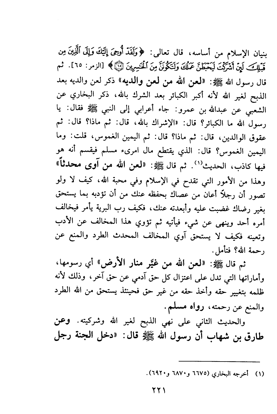 بنيان الإسلام من أساسه، قال تعالى: {وَلَقَدْ أُوحِيَ إِلَيْكَ وَإِلَى الَّذِينَ مِنْ قَبْلِكَ لَئِنْ أَشْرَكْتَ لَيَحْبَطَنَّ عَمَلُكَ وَلَتَكُونَنَّ مِنَ الْخَاسِرِينَ} . [الزمر: 65] . ثم قال رسول الله صلى الله عليه وسلم: "لعن الله من لعن والديه" ذكر لعن والديه بعد الذبح لغير الله لأنه أكبر الكبائر بعد الشرك بالله، ذكر البخاري عن الشعبي عن عبد الله بن عمرو: جاء أعرابي إلى النبي صلى الله عليه وسلم فقال: يا رسول الله ما الكبائر؟ قال: "الإشراك بالله، قال: ثم ماذا؟ قال: ثم عقوق الوالدين، قال: ثم ماذا؟ قال: ثم اليمين الغموس، قلت: وما اليمين الغموس؟ قال: الذي يقتطع مال امرئ مسلم فيقسم أنه هو فيها كاذب"، الحديث1. ثم قال صلى الله عليه وسلم: "لعن الله من آوى محدثاً" وهذا من الأمور التي تقدح في الإسلام وفي محبة الله، كيف لا ولو تصور أن رجلاً أعان من عصاك بحفظه عنك من أن تؤدبه بما يستحق بغير رضاك غضبت عليه وأبعدته عنك، فكيف رب البرية يأمر فيخالف أمره أحد وينهى عن شيء فيأتيه ثم تؤوي هذا المخالف عن الأدب وتعينه فكيف لا يستحق آوي المخالف المحدث الطرد والمنع عن رحمة الله؟ فتأمل.