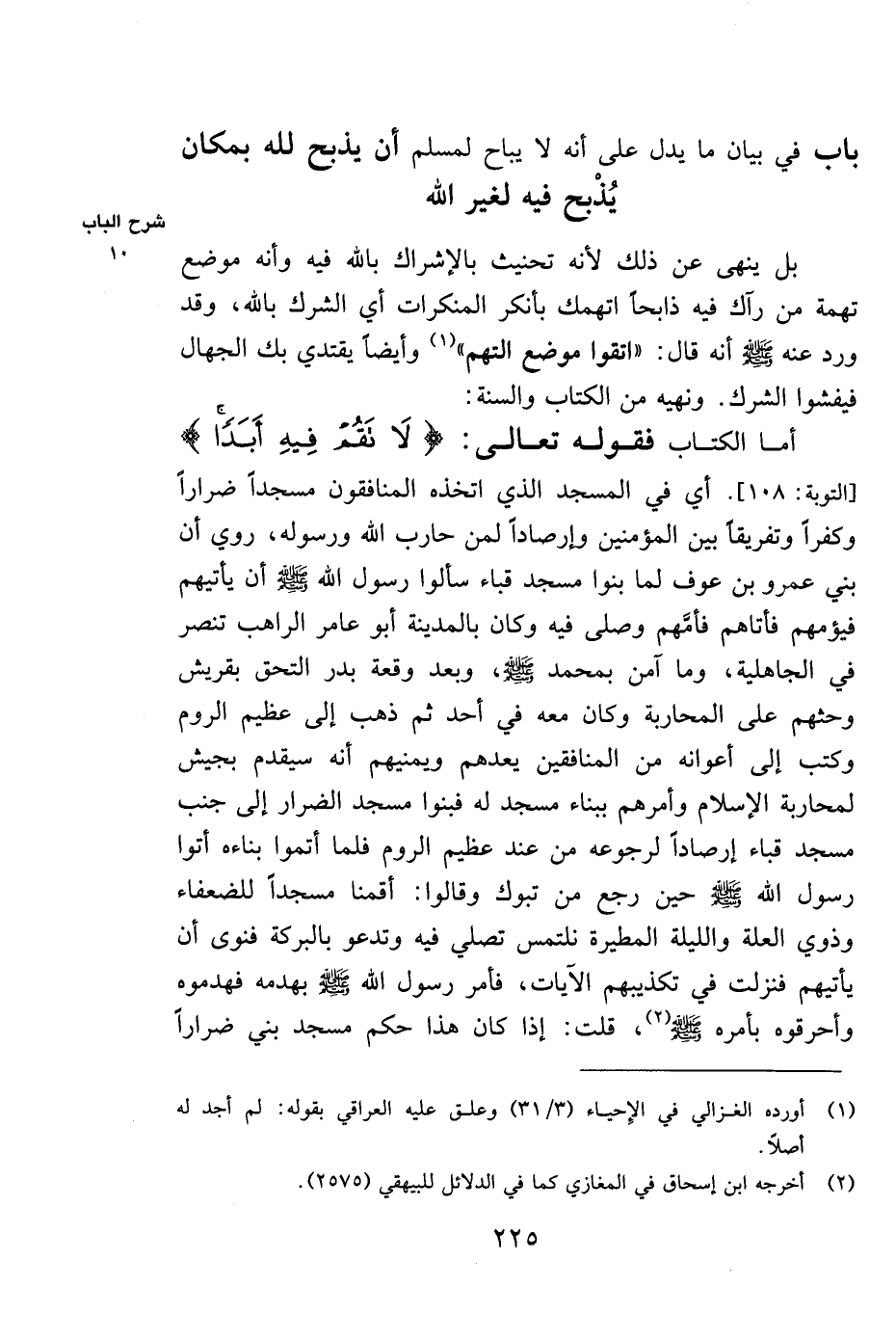 بل ينهى عن ذلك لأنه تحنيث بالإشراك بالله فيه وأنه موضع تهمة من رآك فيه ذابحاً اتهمك بأنكر المنكرات أي الشرك بالله، وقد ورد عنه صلى الله عليه وسلم أنه قال: "اتقوا موضع التهم" 1. وأيضاً يقتدي بك الجهال فيفشوا الشرك. ونهيه من الكتاب والسنة.