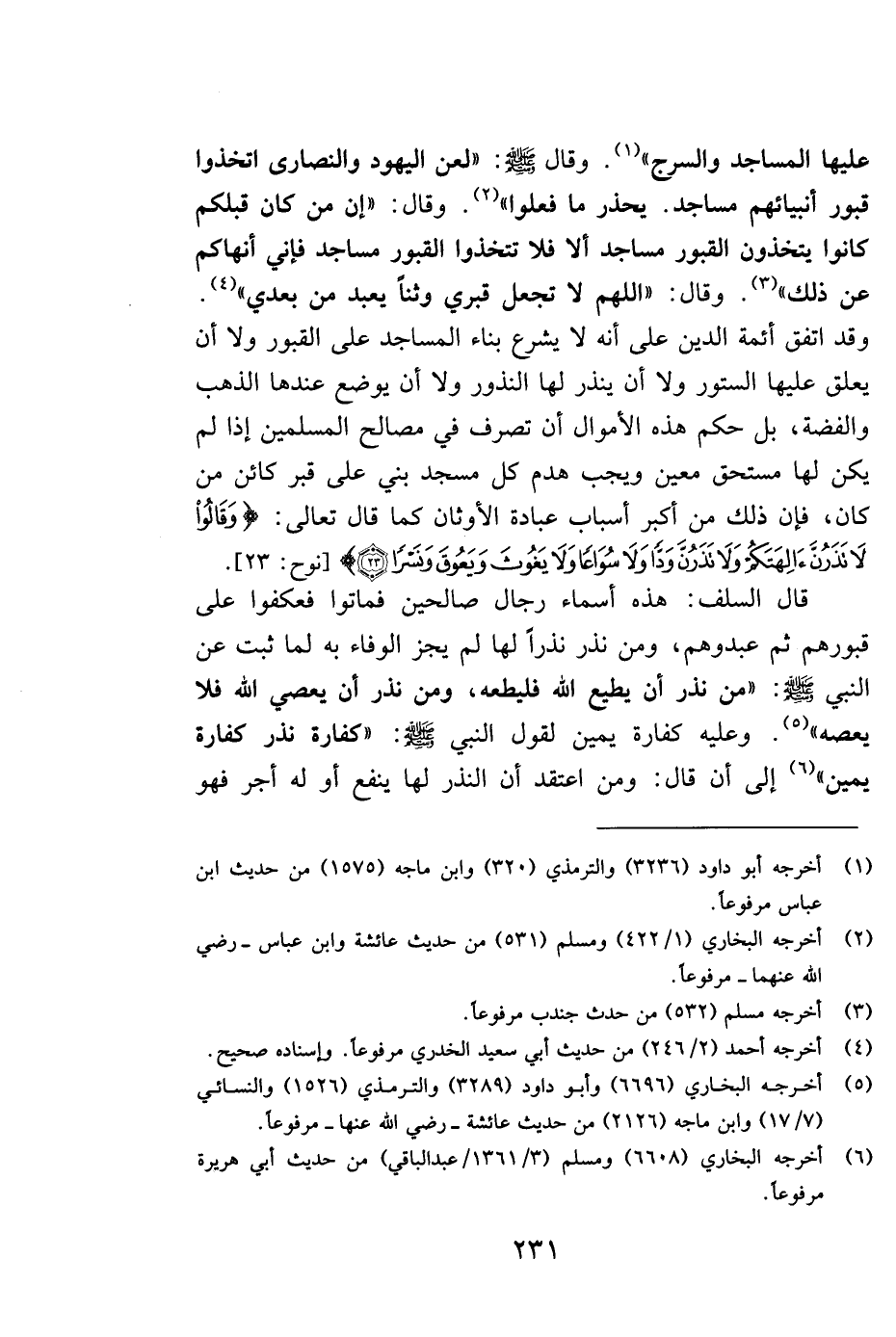 قال السلف: هذه أسماء رجال صالحين فماتوا فعكفوا على قبورهم ثم عبدوهم، ومن نذر نذراً لها لم يجز الوفاء به لما ثبت عن النبي صلى الله عليه وسلم: "من نذر أن يطيع الله فليطعه، ومن نذر أن يعصي الله فلا يعصه" 5. وعليه كفارة يمين لقول النبي صلى الله عليه وسلم: "كفارة نذر كفارة يمين" 6. إلى أن قال: ومن اعتقد أن النذر لها ينفع أو له أجر فهو