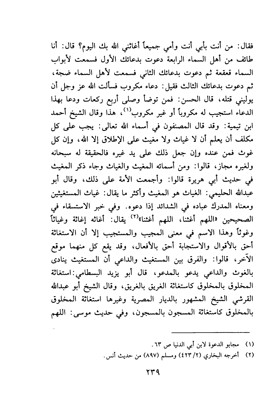 فقال: من أنت بأبي أنت وأمي جميعاً أغاثني الله بك اليوم؟ قال: أنا طائف من أهل السماء الرابعة دعوت بدعائك الأول فسمعت لأبواب السماء قعقعة ثم دعوة بدعائك الثاني فسمعت لأهل السماء ضجة، ثم دعوت بدعائك الثالث: فقيل: دعاء مكروب فسألت الله عز وجل أن يوليني قتله، قال الحسن: فمن توضأ وصلى أربع ركعات ودعا بهذا الدعاء استجيب له مكروباً أو غير مكروب1، هذا وقال الشيخ أحمد ابن تيمية: وقد قال المصنفون في أسماء الله تعالى: يجب على كل مكلف أن يعلم أن لا غياث ولا مغيث على الإطلاق إلا الله، وإن كل غوث فمن عنده وإن جعل ذلك على يد غيره فالحقيقة له سبحانه ولغيره مجاز، قالوا: ومن أسمائه المغيث والغياث وجاء ذكر المغيث في حديث أبي هريرة، قالوا: وأجمعت الأمة على ذلك، وقال أبو عبد الله الحليمي: الغياث هو المغيث وأكثر ما يقال: غياث المستغيثين ومعناه المدرك عباده في الشدائد إذا دعوه. وفي خبر الاستسقاء في الصحيحين "اللهم أغثنا، اللهم أغثنا" 2 يقال: أغاثه إغاثة وغياثاً وغوثاً وهذا الاسم في معنى المجيب والمستجيب إلا أن الإستغاثة أحق بالأفعال والاستجابة أحق بالأقوال، وقد يقع كل منهما موقع الآخر، قالوا: والفرق بين المستغيث والداعي أن المستغيث ينادي بالغوث والداعي يدعو بالمدعو، قال أبو يزيد البسطامي: استغاثة المخلوق بالمخلوق كاستغاثة الغريق بالغريق، وقال الشيخ أبو عبد الله القرشي الشيخ المشهور بالديار المصرية وغيرها: استغاثة المخلوق بالمخلوق كاستغاثة المسجون بالمسجون، وفي حديث موسى: اللهم