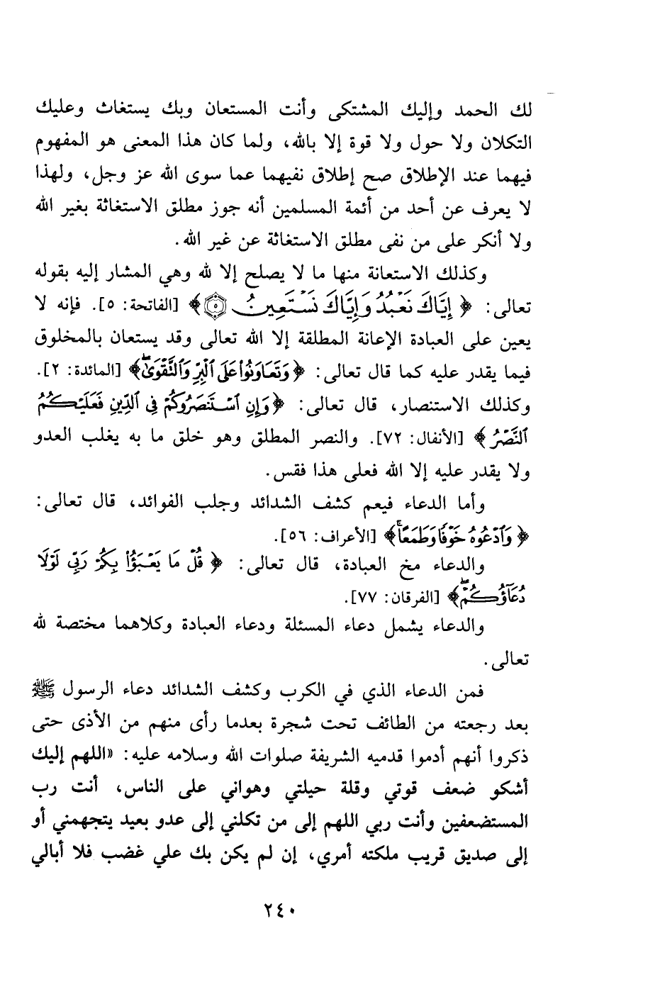 لك الحمد وإليك المشتكى وأنت المستعان وبك يستغاث وعليك التكلان ولا حول ولا قوة إلا بالله، ولما كان هذا المعنى هو المفهوم فيهما عند الإطلاق صح إطلاق نفيهما عما سوى الله عز وجل، ولهذا لا يعرف عن أحد من أئمة المسلمين أنه جوز مطلق الاستغاثة بغير الله تعالى ولا أنكر على من نفى مطلق الاستغاثة عن غير الله.