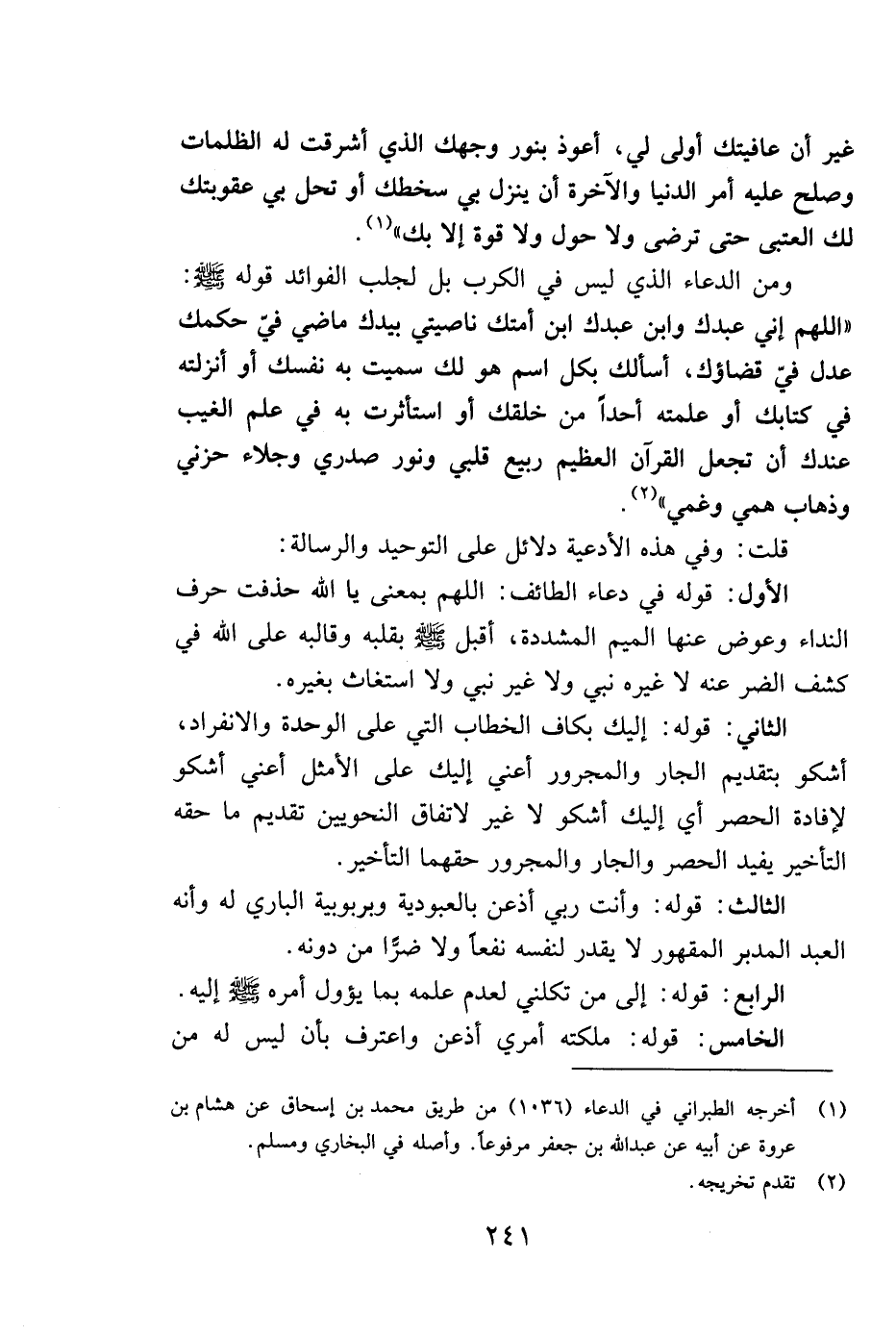 الأول: قوله في دعاء الطائف: اللهم بمعنى يا الله حذفت حرف النداء وعوض عناه الميم المشددة، أقبل صلى الله عليه وسلم بقلبه وقالبه على الله في كشف الضر عنه لا غيره نبي ولا غير نبي ولا استغاث بغيره.