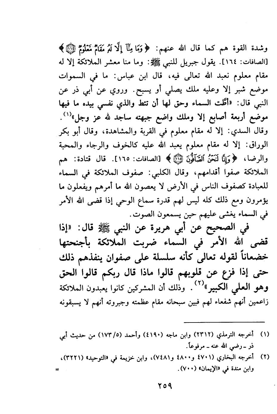 وشدة القوة هم كما قال عنهم: {وَمَا مِنَّا إِلَّا لَهُ مَقَامٌ مَعْلُومٌ} . [الصافات: 164] . يقول جبريل للنبي صلى الله عليه وسلم: "وما منا معشر الملائكة إلا له مقام معلوم نعبد الله تعالى فيه". قال ابن العباس: ما في السماوات موضع شبر إلا وعليه ملك يصلي أو يسبح. وروي عن أبي ذر عن النبي قال: "أطَّت السماء وحق لها أن تئط والذي نفسي بيده ما فيها موضع أربعة أصابع إلا وملك واضع جبهته ساجد لله عز وجل" 1. وقال السدي: إلا له مقام معلوم في القربة والمشاهدة، وقال أبو بكر الوراق: إلا له مقام معلوم يعبد الله عليه كالخوف والرجاء والمحبة والرضا، {وَإِنَّا لَنَحْنُ الصَّافُّونَ} . [الصافات: 165] . قال قتادة: هم الملائكة صفوا أقدامهم، وقال الكلبي، صفوف الملائكة في السماء للعبادة كصفوف الناس في الأرض لا يعصون الله ما أمرهم ويفعلون ما يؤمرون ومع ذلك كله ليس لهم قدرة سماع الوحي إذا قضى الله الأمر في السماء يغشى عليهم حين يسمعون الصوت.