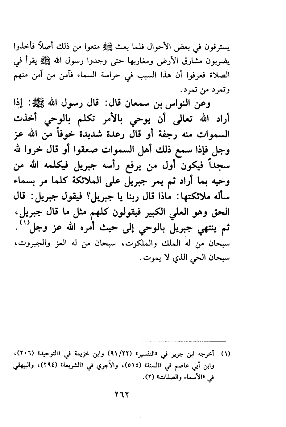 وعن النواس بن سمعان قال: قال رسول الله صلى الله عليه وسلم: "إذا أراد الله تعالى أن يوحي بالأمر تكلم بالوحي أخذت السموات منه رجفة أو قال رعدة شديدة خوفاً من الله عز وجل فإذا سمع ذلك أهل السماوات صعقوا وخروا لله سجداً. فيكون أول من يرفع رأسه جبريل فيكلمه الله من وحيه بما أراد ثم يمر جبريل على الملائكة كلما مر بسماء سأله ملائكتها: ماذا قال ربنا يا جبريل؟ فيقول جبريل: قال الحق وهو العلي الكبير، فيقولون كلهم مثل ما قال جبريل، ثم ينتهي جبريل بالوحي إلى حيث أمره الله عز وجل" 1. سبحان من له الملك والملكوت، سبحان من له العز والجبروت، سبحان الحي الذي لا يموت.