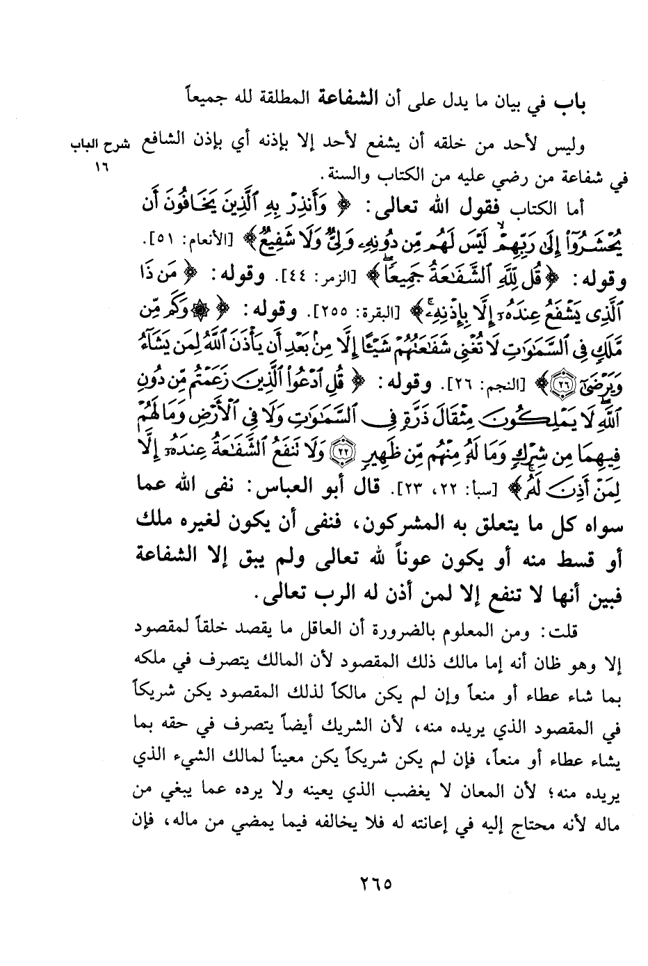 أما الكتاب فقوله الله تعالى: {وَأَنْذِرْ بِهِ الَّذِينَ يَخَافُونَ أَنْ يُحْشَرُوا إِلَى رَبِّهِمْ لَيْسَ لَهُمْ مِنْ دُونِهِ وَلِيٌّ وَلا شَفِيعٌ} [الأنعام: 51] . وقوله: {قُلْ لِلَّهِ الشَّفَاعَةُ جَمِيعاً} [الزمر: 44] . وقوله: {مَنْ ذَا الَّذِي يَشْفَعُ عِنْدَهُ إِلَّا بِإِذْنِهِ} [البقرة: 255] . وقوله: {وَكَمْ مِنْ مَلَكٍ فِي السَّمَاوَاتِ لا تُغْنِي شَفَاعَتُهُمْ شَيْئاً إِلَّا مِنْ بَعْدِ أَنْ يَأْذَنَ اللَّهُ لِمَنْ يَشَاءُ وَيَرْضَى} [النجم: 26] . وقوله: {قُلِ ادْعُوا الَّذِينَ زَعَمْتُمْ مِنْ دُونِ اللَّهِ لا يَمْلِكُونَ مِثْقَالَ ذَرَّةٍ فِي السَّمَاوَاتِ وَلا فِي الْأَرْضِ وَمَا لَهُمْ فِيهِمَا مِنْ شِرْكٍ وَمَا لَهُ مِنْهُمْ مِنْ ظَهِيرٍ وَلا تَنْفَعُ الشَّفَاعَةُ عِنْدَهُ إِلَّا لِمَنْ أَذِنَ لَهُ} [سبأ: 22، 23] . قال أبو العباس: نفى الله عما سواه كل ما يتعلق به المشركون، فنفى أن يكون لغيره ملك أو قسط منه أو يكون عوناً لله تعالى ولم يبق إلا الشفاعة فبين أنها لا تنفع إلا لمن أذن له الرب تعالى.