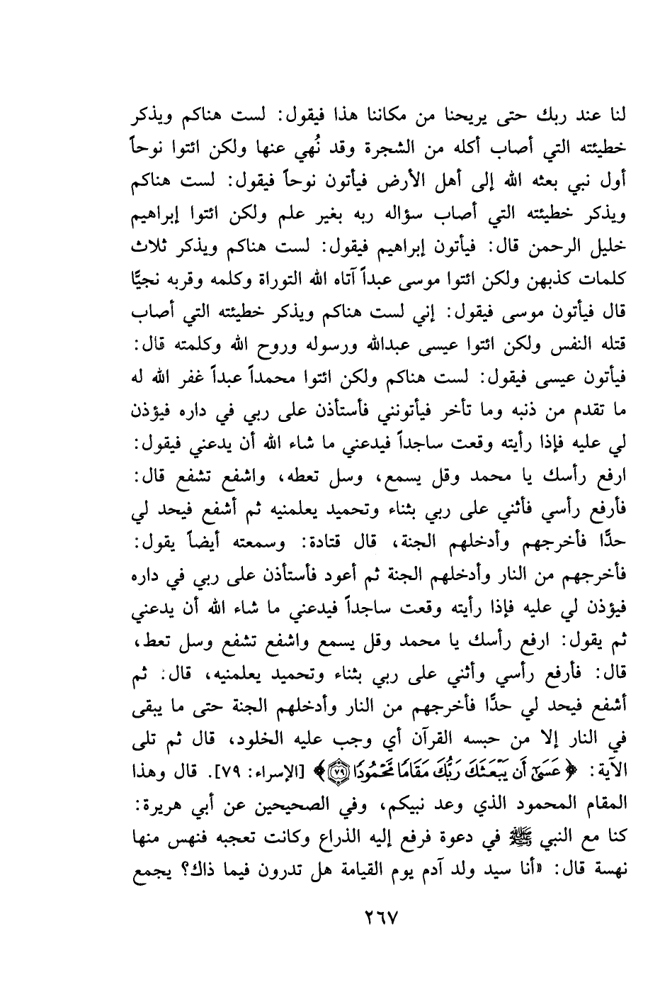 لنا عند ربك حتى يريحنا من مكاننا هذا. فيقول: لست هناكم، ويذكر خطيئته التي أصاب أكله من الشجرة وقد نُهي عنها، ولكن ائتوا نوحاً أول نبي بعثه الله إلى أهل الأرض، فيأتون نوحاً فيقول: لست هناكم، ويذكر خطيئته التي أصاب: سؤاله ربه بغير علم، ولكن ائتوا إبراهيم خليل الرحمن، قال: فيأتون إبراهيم فيقول: إني لست هناكم، ويذكر ثلاث كلمات كذبهنَّ، ولكن ائتوا موسى: عبداً آتاه الله التوراة وكلمه وقرَّبه نجيًّا، قال: فيأتون موسى فيقول: إني لست هناكم، ويذكر خطيئته التي أصاب: قتله النفس، ولكن ائتوا عيسى عبد الله ورسوله، وروح الله وكلمته، قال: فيأتون عيسى فيقول: لست هناكم، ولكن ائتوا محمداً صلى الله عليه وسلم عبداً غفر الله له ما تقدم من ذنبه وما تأخر، فيأتوني، فأستأذن على ربي في داره فيؤذن لي عليه، فإذا رأيته وقعت ساجداً، فيدعني ما شاء الله أن يدعني، فيقول: ارفع محمد، وقل يُسمع، وسل تُعْطَ، واشفع تُشَفَّع، قال: فأرفع رأسي فأثني على ربي بثناء وتحميد يعلمنيه، ثم أشفع فيحد لي حداً، فأخرجهم فأدخلهم الجنة، قال قتادة: وسمعته أيضاً يقول: فأخرجهم من النار وأدخلهم الجنة، ثم أعود فأستأذن على ربي في داره، فيؤذن لي عليه، فإذا رأيته وقعت ساجداً، فيدعني ما شاء الله أن يدعني، ثم يقول: ارفع محمد، وقل يُسمع، واشفع تُشَفَّعْ، وسل تُعط، قال: فأرفع رأسي فأثني على ربي بثناء وتحميد يعلمنيه، قال: ثم أشفع فيحد لي حداً، فأخرجهم من النار وأدخلهم الجنة، حتى ما يبقى في النار إلا من حبسه القرآن. أي وجب عليه الخلود. قال: ثم تلا الآية: {عَسَى أَنْ يَبْعَثَكَ رَبُّكَ مَقَاماً مَحْمُوداً} [الإسراء: 79] . قال: وهذا المقام المحمود الذي وعده نبيكم".