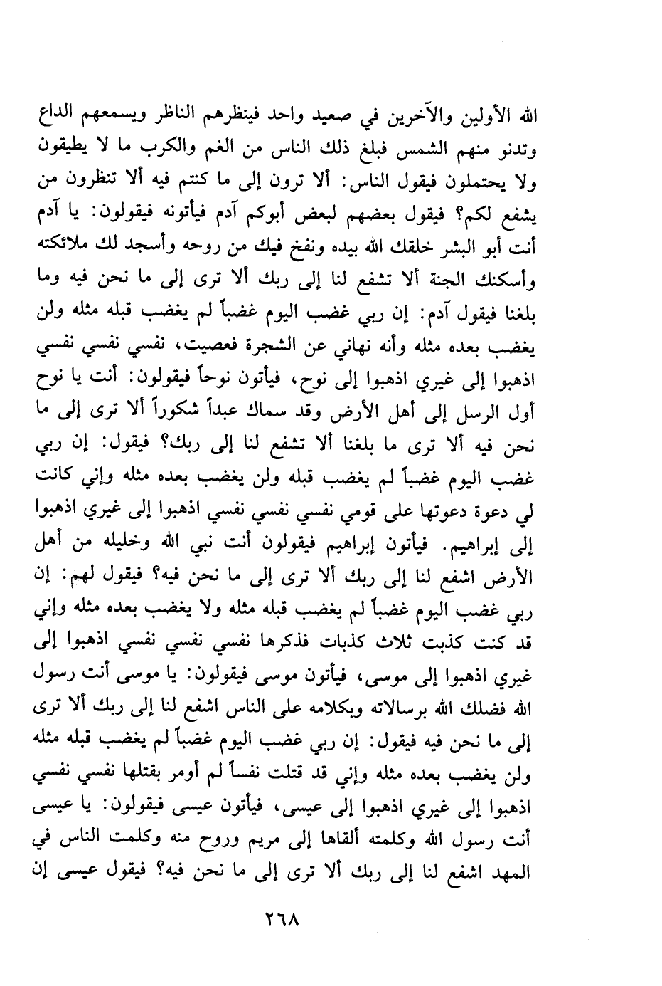الله الأولين والآخرين في صعيد واحد، فينظرهم الناظر، ويسمعهم الداع، وتدنو منهم الشمس، فبلغ ذلك الناس من الغم والكرب ما لا يطيقون ولا يحتملون، فيقول الناس: ألا ترون إلى ما كنتم فيه، ألا تنظرون من يشفع لكم؟ فيقول بعضهم لبعض: أبوكم بآدم، فيأتونه فيقولون: يا آدم أنت أبو البشر، خلقك الله بيده، ونفخ فيك من روحه، وأسد لك ملائكته، وأسكنك الجنة، ألا تشفع لنا إلى ربك، ألا ترى إلى ما نحن فيه، وما بلغنا؟ فيقول آدم: إن ربي غضب اليوم غضباً لم يغضب قبله مثله، ولن يغضب بعده مثله، وإنه نهاني عن الشجرة فعصيت، نفسي نفسي نفسي، اذهبوا إلى غيري، اذهبوا إلى نوح. فيأتون نوحاً فيقولون: أنت يا نوح، أول الرسل إلى أهل الأرض، وقد سماك عبداً شكوراً، ألا ترى إلى ما بلغنا، ألا تشفع لنا إلى ربك؟ فيقول: إن ربي غضب اليوم غضباً لم يغضب قبله، ولن يغضب بعده مثله، وإني كانت لي دعوة دعوتها على قومي، نفسي نفسي نفسي، اذهبوا إلى غيري، اذهبوا إلى إبراهيم. فيأتون إبراهيم فيقولون: أنت نبي الله وخليله من أهل الأرض، اشفع لنا إلى ربك، ألا ترى إلى ما نحن فيه؟ فيقول لهم: إن ربي غضب اليوم غضباً لم يغضب قبله مثله، ولا يغضب بعده مثله، وإني قد كنت كذبت ثلاث كذبات فذكرها، نفسي نفسي نفسي، اذهبوا إلى غيري، اذهبوا إلى موسى. فيأتون موسى فيقولون: يا موسى، أنت رسول الله، فضلك الله برسالاته وبكلامه على الناس، اشفع لنا إلى ربك، ألا ترى إلى ما نحن فيه؟ فيقول: إن ربي غضب اليوم غضباً لم يغضب قبله مثله، ولن يغضب بعده مثله، وإني قد قتلت نفساً لم أومر بقتلها، نفسي نفسي نفسي، اذهبوا إلى غيري، اذهبوا إلى عيسى. فيأتون عيسى فيقولون: يا عيسى، أنت رسول الله، وكلمته ألقاها إلى مريم وروح منه، وكلمت الناس في المهد، اشفع لنا إلى ربك، ألا ترى إلى ما نحن فيه؟ فيقول عيسى: إن
