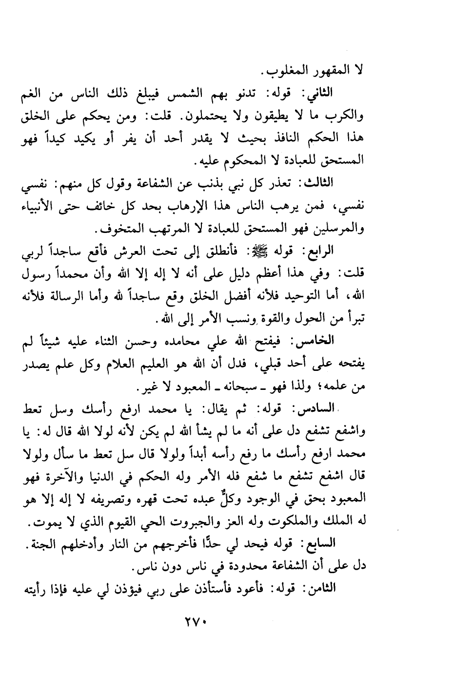 السادس: قوله: ثم يقال: يا محمد ارفع رأسك وسل تعط واشفع تشفع دل على أنه ما لم يشأ الله لم يكن لأنه لولا الله قال له: يا محمد ارفع رأسك ما رفع رأسه أبداً ولولا قال سل تعط ما سأل ولولا قال اشفع تشفع ما شفع له فله الأمر وله الحكم في الدنيا والآخرة فهو المعبود بحق في الوجود وكلٌّ عبده تحت قهره وتصريفه لا إله إلا هو له الملك والملكوت وله العز والجبروت الحي القيوم الذي لا يموت.