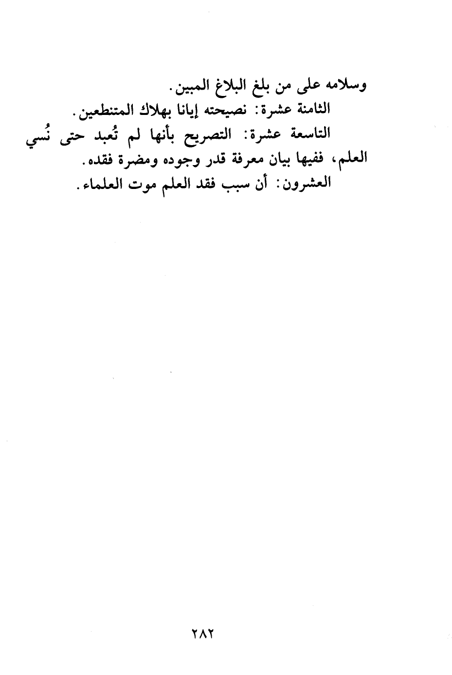 التاسعة عشرة: التصريح بأنها لم تُعبد حتى نُسي العلم، ففيها بيان معرفة قدر وجوده ومضرة فقده.