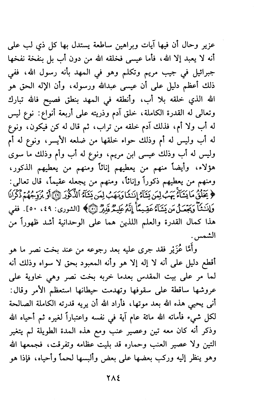 عزير وحال أن فيها آيات وبراهين ساطعة يستدل بها كل ذي لب على أنه لا يعبد إلا الله، فأما عيسى فخلقه الله من دون أب بل بنفخة نفخها جبرائيل في جيب مريم وتكلم وهو المهد بأنه رسول الله، ففي ذلك أعظم دليل على أن عيسى عبد الله ورسوله، وأن الإله الحق هو الله الذي خلقه بلا أب، وأنطقه في المهد بنطق فصيح فالله تبارك وتعالى له القدرة الكاملة، خلق آدم وذريته على أربعة أنواع: نوع ليس له أب ولا أم، فذلك آدم خلقه من تراب، ثم قال له كن فيكون، ونوع له أب وليس له أم ذلك حواء خلقها من ضلعه الأيسر، ونوع له وليس له أب وذلك عيسى ابن مريم، ونوع له أب وأم وذلك ما سوى هؤلاء، وأيضاً منهم من يعطيهم ذكوراً وإناثاً، ومنهم من يجعله عقيماً، قال تعالى: {يَخْلُقُ مَا يَشَاءُ يَهَبُ لِمَنْ يَشَاءُ إِنَاثاً وَيَهَبُ لِمَنْ يَشَاءُ الذُّكُورَ أَوْ يُزَوِّجُهُمْ ذُكْرَاناً وَإِنَاثاً وَيَجْعَلُ مَنْ يَشَاءُ عَقِيماً إِنَّهُ عَلِيمٌ قَدِيرٌ} . [الشورى: 49، 50] . ففي هذا كمال القدرة واعلم اللذين هما على الوحدانية أشد ظهوراً من الشمس.