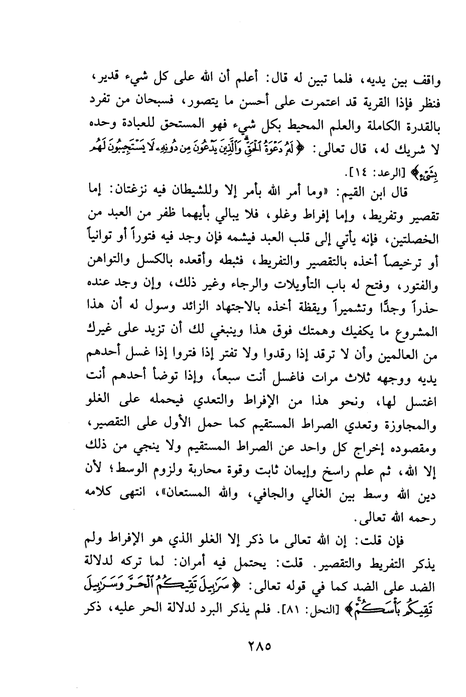 قال ابن القيم: " وما أمر الله بأمر إلا وللشيطان فيه نزغتان: إما تقصير وتفريط، وإما إفراط وغلو، فلا يبالي بأيهما ظفر من العبد من الخصلتين، فإنه يأتي إلى قلب العبد فيشمه فإن وجد فيه فتوراً أو توانياً أو ترخيصاً أخذه بالتقصير والتفريط، فثبطه وأقعده بالكسل والتواهن والفتور، وفتح له باب التأويلات والرجاء وغير ذلك، وإن وجد عنده حذرا وجدًّا وتشميراً ويقظة أخذه بالاجتهاد الزائد وسول له أن هذا المشروع ما يكفيك وهمتك فوق هذا وينبغي لك أن تزيد على العاملين وأن لا ترقد إذا رقدوا ولا تفتر إذا فتروا، إذا غسل أحدهم يديه ووجهه ثلاث مرات فاغسل أنت سبعاً، وإذا توضأ أنت اغتسل لها، ونحو هذا من الإفراط والتعدي فيحمله على الغلو والمجاوزة وتعدي الصراط المستقيم، كما يحمل الأول على التقصير، ومقصوده إخراج كل واحد عن الصراط المستقيم ولا ينجي من ذلك إلا الله؛ ثم علم راسخ وإيمان ثابت وقوة على محاربة ولزوم الوسط؛ لأن دين الله وسط بين الغالي والجافي، والله المستعان" انتهى كلامه رحمه الله تعالى.