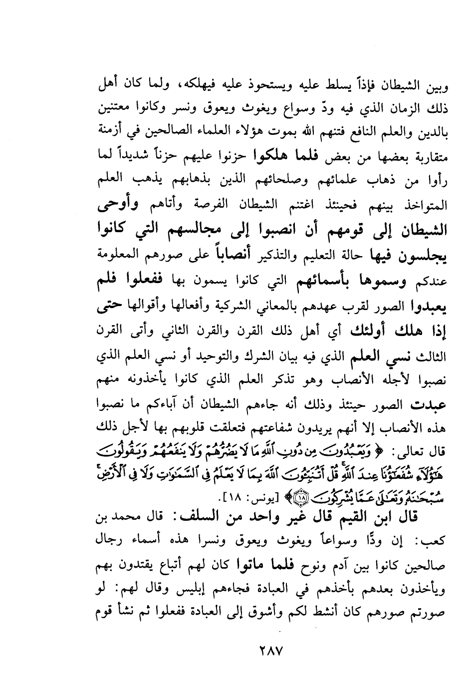 وبين الشيطان فإذاً يسلط عليه ويستحوذ عليه فيهلكه، ولما كان أهل ذلك الزمان الذي فيه ودّ وسواع ويغوث ويعوق ونسر وكانوا معتنين بالدين والعلم النافع فتنهم الله بموت هؤلاء العلماء الصالحين في أزمنة متقاربة بعضها من بعض فلما هلكوا حزنوا عليهم حزناً شديداً لما رأوا من ذهاب علمائهم وصلحائهم الذين بذهابهم يذهب العلم المتواخذ بينهم فحينئذ اغتنم الشيطان الفرصة وأتاهم وأوحى الشيطان إلى قومهم أن انصبوا إلى مجالسهم التي كانوا يجلسون فيها حالة التعليم والتذكير أنصاباً على صورهم المعلومة عندكم وسموها بأسمائهم التي كانوا يسمون بها ففعلوا فلم يعبدوا الصور لقرب عهدهم بالمعاني الشركية وأفعالها وأقوالها حتى إذا هلك أولئك أي أهل ذلك القرن والقرن الثاني وأتى القرن الثالث نسي العلم الذي فيه بيان الشرك والتوحيد أو نسي العلم الذي نصبوا لأجله الأنصاب وهو تذكر العلم الذي كانوا يأخذونه منهم عبدت الصور حينئذ وذلك أنه جاءهم الشيطان أن آبائكم ما نصبوا هذه الأنصاب إلا أنهم يريدون شفاعتهم فتعلقت قلوبهم بها لأجل ذلك قال تعالى: {وَيَعْبُدُونَ مِنْ دُونِ اللَّهِ مَا لا يَضُرُّهُمْ وَلا يَنْفَعُهُمْ وَيَقُولُونَ هَؤُلاءِ شُفَعَاؤُنَا عِنْدَ اللَّهِ قُلْ أَتُنَبِّئُونَ اللَّهَ بِمَا لا يَعْلَمُ فِي السَّمَاوَاتِ وَلا فِي الْأَرْضِ سُبْحَانَهُ وَتَعَالَى عَمَّا يُشْرِكُونَ} . [يونس: 18] .