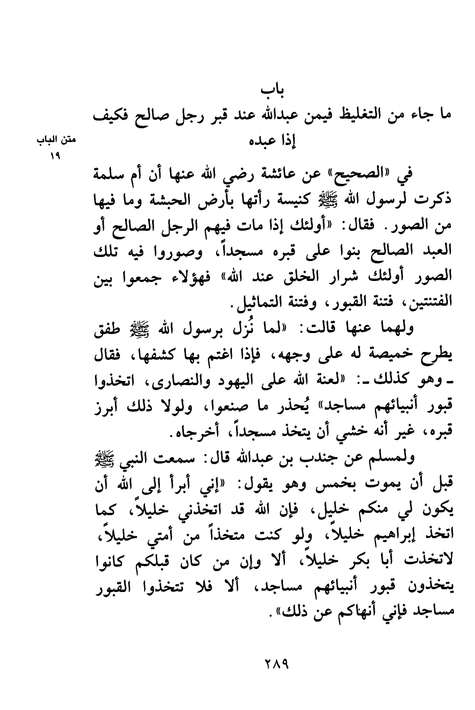 ولمسلم عن جندب بن عبد الله قال: سمعت النبي صلى الله عليه وسلم قبل أن يموت بخمس وهو يقول: "إني أبرأ إلى الله أن يكون لي منكم خليل، فإن الله قد اتخذني خليلاً، كما اتخذ إبراهيم خليلاً، ولو كنت متخذاً من أمتي خليلاً، لاتخذت أبا بكر خليلاً، ألا وإن من كان قبلكم كانوا يتخذون قبور أنبيائهم مساجد، ألا فلا تتخذوا القبور مساجد، فإني أنهاكم عن ذلك".