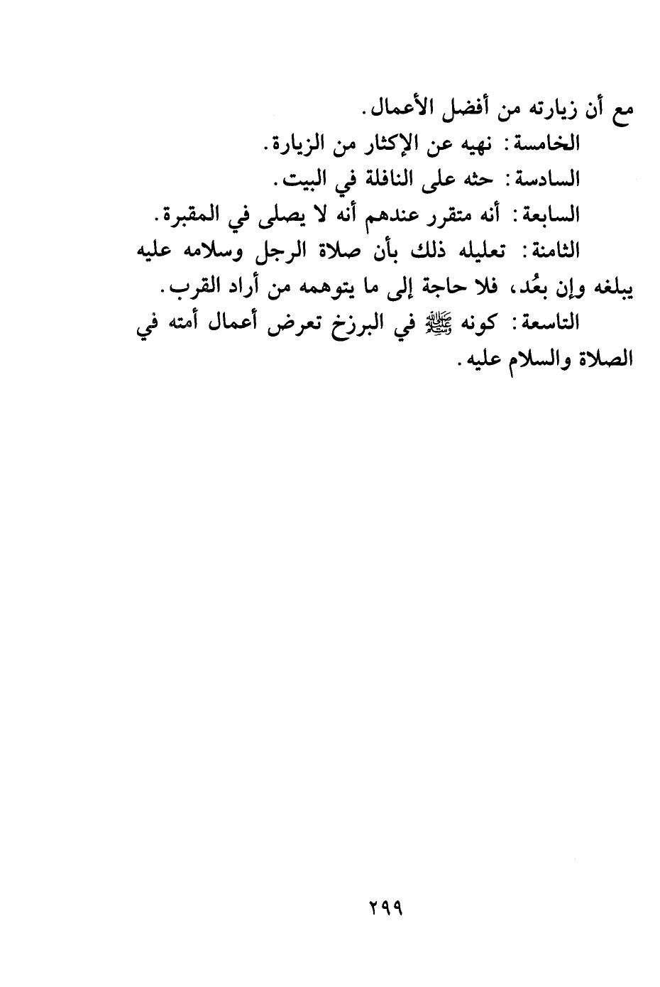 التاسعة: كونه صلى الله عليه وسلم في البرزخ تعرض أعمال أمته في الصلاة والسلام عليه.