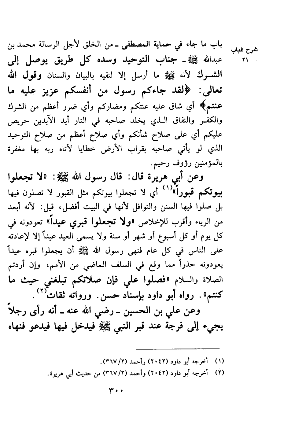 باب ما جاء في حماية المصطفى –من الخلق لأجل الرسالة محمد بن عبد الله صلى الله عليه وسلم جناب التوحيد وسده كل طريق يوصل إلى الشرك لأنه صلى الله عليه وسلم ما أرسل إلا لنفيه بالبيان والسنان وقوله الله تعالى {لَقَدْ جَاءَكُمْ رَسُولٌ مِنْ أَنْفُسِكُمْ عَزِيزٌ عَلَيْهِ مَا عَنِتُّمْ} أي شاق عليه عنتكم ومضاركم وأي ضرر أعظم من الشرك والكفر والنفاق الذي يخلد صاحبه في النار أبد الآبدين حريص عليكم أي على صلاح شأنكم وأي صلاح أعظم من صلاح التوحيد الذي لو يأتي صاحبه بقراب الأرض خطايا لأتاه ربه بها مغفرة بالمؤمنين رؤوف رحيم.