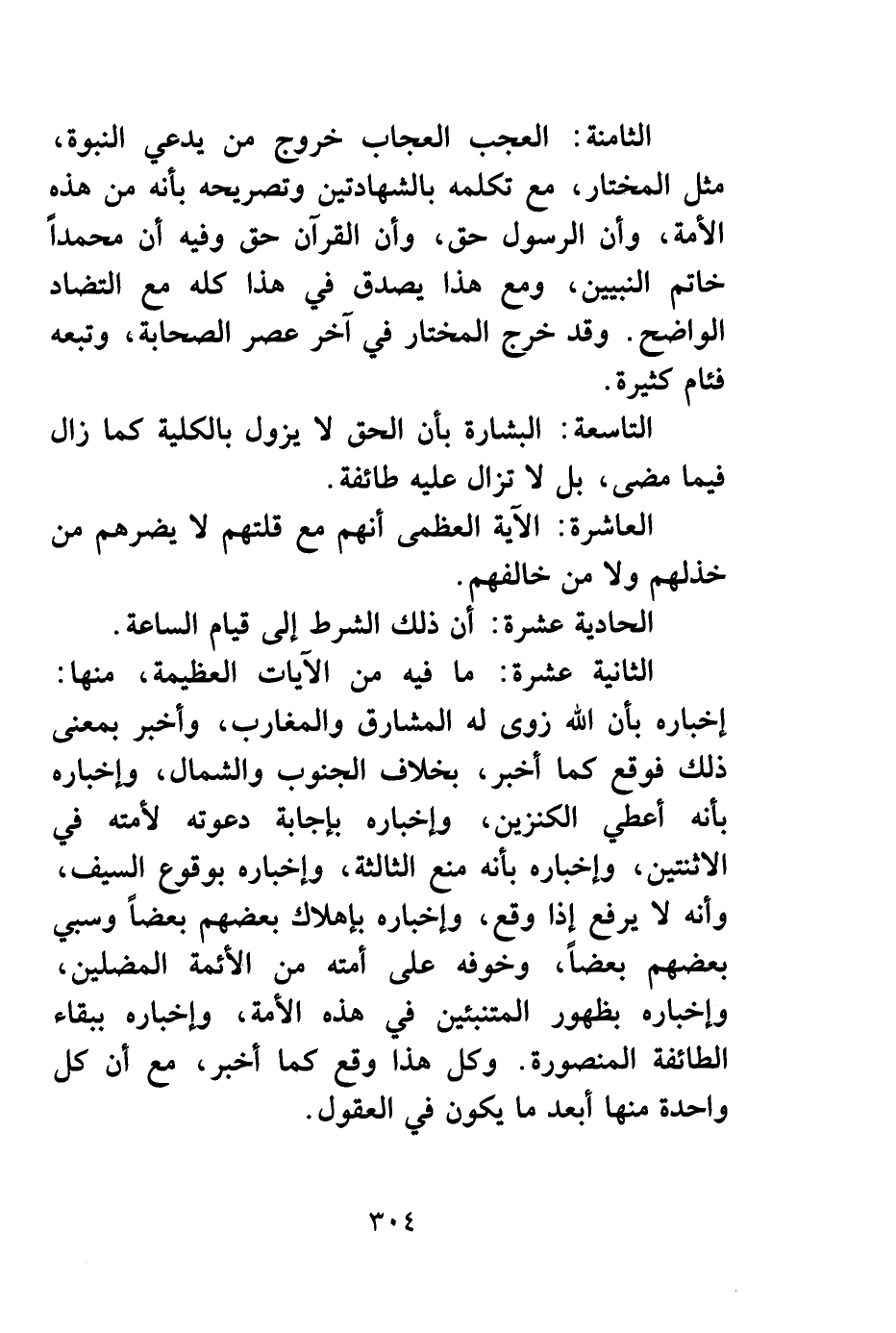 الثامنة: العجب العجاب خروج من يدّعي النبوة، مثل المختار، مع تكلمه بالشهادتين وتصريحه بأنه من هذه الأمة، وأن الرسول حق، وأن القرآن حق وفيه أن محمداً خاتم النبيين، ومع هذا يصدق في هذا كله مع التضاد الواضح. وقد خرج المختار في آخر عصر الصحابة، وتبعه فئام كثيرة.