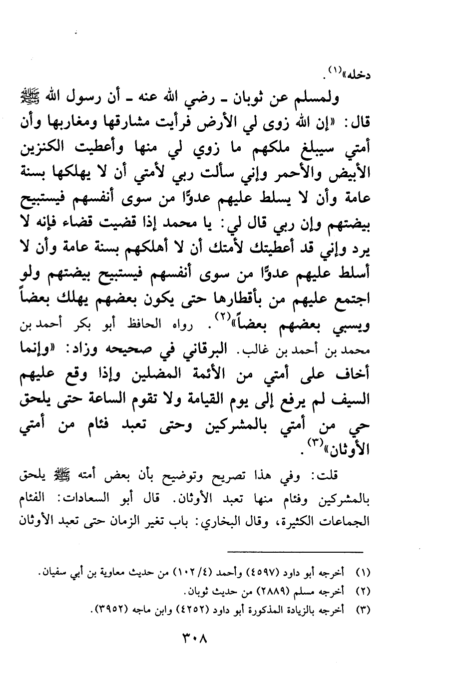 ولمسلم عن ثوبان -رضي الله عنه- أن رسول الله صلى الله عليه وسلم قال: "إن الله زوى لي الأرض فرأيت مشارقها ومغاربها وإن أمتي سيبلغ ملكها ما زوي لي منها وأعطيت الكنزين: الأبيض والأحمر وإني سألت ربي لأمتي أن لا يهلكها بسنة عامة وأن لا يسلط عليهم عدوًّا من سوى أنفسهم فيستبيح بيضتهم وإن ربي قال لي: يا محمد إذا قضيت قضاء فإنه لا يرد وإني قد أعطيتك لأمتك ألا أهلكهم بسنة عامة وأن لا أسلط عليهم عدوًّا من سوى أنفسهم فيستبيح بيضتهم ولو اجتمع عليهم من بأقطارها حتى يكون بعضهم يهلك بعضاً ويسبي بعضهم بعضًا" 2، رواه الحافظ أبو بكر أحمد بن محمد بن أحمد بن غالب البرقاني في صحيحه، وزاد: "وإنما أخاف على أمتي من الأئمة المضلين وإذا وقع عليهم السيف لم يرفع إلى يوم القيامة ولا تقوم الساعة حتى يلحق حي من أمتي بالمشركين وحتى تعبد فئام من أمتي الأوثان" 3.