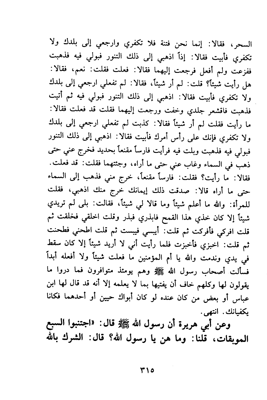 السحر، فقالا: إنما نحن فتية فلا تكفري وارجعي إلى بلدك ولا تكفري فأبيت فقالا: إذاً اذهبي إلى ذلك التنور فبولي فيه فذهبت ففزعت ولم أفعل فرجعت إليهما فقالا: فعلت فقلت: نعم، فقالا: هل رأيت شيئاً؟ قلت: لم أر شيئاً، فقالا: لم تفعلي ارجعي إلى بلدك ولا تكفري فأبيت فقالا: اذهبي إلى ذلك التنور فبولي فيه ثم أتيت فذهبت فاقشعر جلدي وخفت ورجعت إليهما فقلت قد فعلت فقالا: ما رأيت فقلت لم أر شيئاً فقالا: كذبت لم تفعلي ارجعي إلى بلدك ولا تكفري فإنك على رأس أمرك فأبيت فقالا: اذهبي إلى ذلك التنور فبولي فيه فذهبت وبلت فيه فرأيت فارساً مقنعاً بحديد فخرج عني حتى ذهب في السماء وغاب عني حتى ما أراه، وجئتهما فقلت: قد فعلت. فقالا: ما رأيت؟ فقلت: فارساً مقنعاً، خرج مني فذهب إلى السماء حتى ما أراه قالا: صدقت ذلك إيمانك خرج منك اذهبي، فقلت للمرأة: والله ما أعلم شيئاً، فقالت: بلى لم تريدي شيئاً إلا كان خذي هذا القمح فبذري فبذر وقلت اخلقي فخلقت ثم قلت افركي فأفركت ثم قلت: أيبسي فيبست ثم قلت اطحني فطحنت ثم قلت: اخبزي فأخبزت فلما رأيت أني لا أريد شيئاً إلا كان سقط في يدي وندمت والله يا أم المؤمنين ما فعلت شيئاً ولا أفعله أبداً فسألت أصحاب رسول الله صلى الله عليه وسلم وهم يومئذ متوافرون فما دروا ما يقولون لها ولكهم خاف أن يفتيها بما لا يعلمه إلا أنه قد قال لها ابن عباس أو بعض من كان عنده لو كان أبواك حيين أو أحدهما فكانا يكفيانك. انتهى.