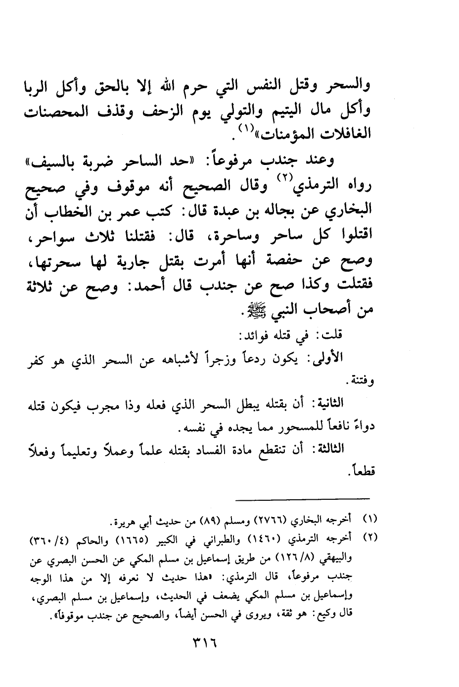 1وعن جندب مرفوعاً: "حد الساحر ضربة بالسيف" رواه الترمذي2 وقال: الصحيح أنه موقوف وفي صحيح البخاري عن بجالة بن عبدة قال: كتب عمر بن الخطاب: أن اقتلوا كل ساحر وساحرة، قال: فقتلنا ثلاث سواحر، وصح عن حفصة أنها أمرت بقتل جارية لها سحرتها، فقتلت وكذلك صح عن جندب قال أحمد: وصح عن ثلاثة من أصحاب النبي صلى الله عليه وسلم.