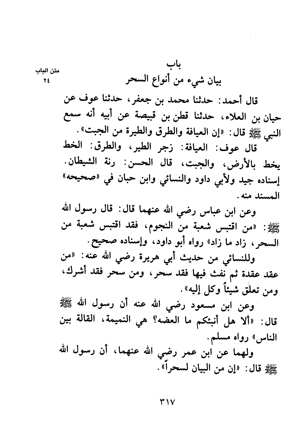 قال أحمد: حدثنا محمد بن جعفر، حدثنا عوف عن حيان بن العلاء، حدثنا قطن بن قبيصة عن أبيه أنه سمع النبي صلى الله عليه وسلم قال: "إن العيافة والطرق والطيرة من الجبت".