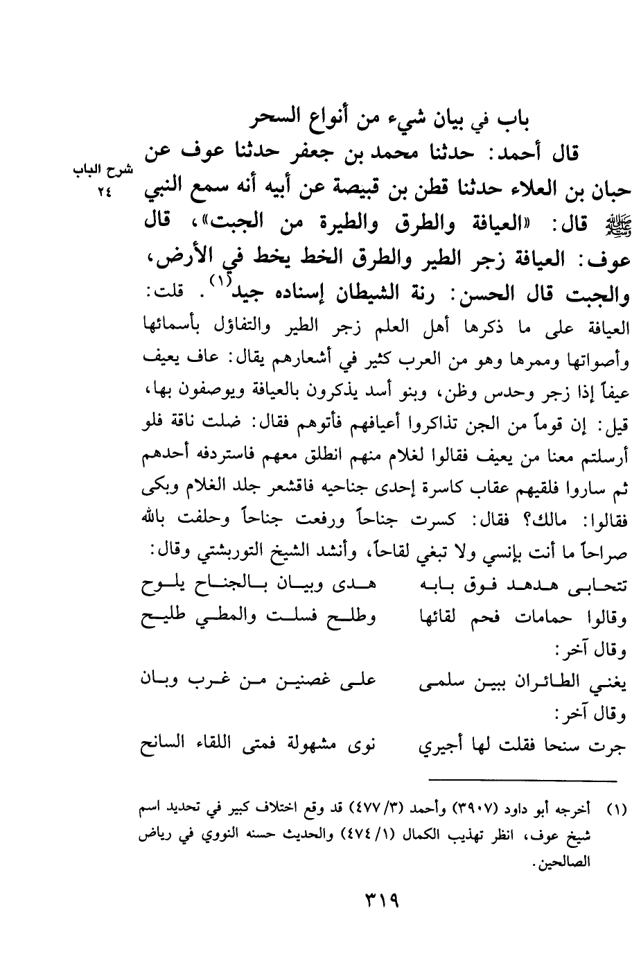 قال أحمد: حدثنا محمد بن جعفر حدثنا عوف عن حبان بن العلاء حدثنا قطن بن قبيصة عن أبيه أنه سمع النبي صلى الله عليه وسلم قال: " العيافة والطرق والطيرة من الجبت"، قال عوف: العيافة زجر الطير والطرق الخط يخط في الأرض، والجبت قال الحسن: رنة الشيطان إسناده جيد1. قلت: العيافة على ما ذكرها أهل العلم زجر الطير والتفاؤل بأسمائها وأصواتها وممرها وهو من العرب كثير في أشعارهم يقال: عاف يعيف عيفاً إذا زجر وحدس وظن، وبنوا أسد يذكرون بالعيافة ويوصفون بها، قيل: إن قوماً من الجن تذاكروا أعيافهم فأتوهم فقالوا: ضلت ناقة فلو أرسلتم مهنا من يعيف فقالوا لغلامهم انطلق معهم فاستردفه أحدهم ثم ساروا فلقيهم عقاب كاسرة أحدى جناحيه فاقشعر جلد الغلام وبكى فقالوا: مالك؟ فقال: كسرت جناحاً ورفعت جناحاً وحلفت بالله صراحاً ما أنت بإنسي ولا تبغي لقاحاً، وأنشد التوربشتي وقال: