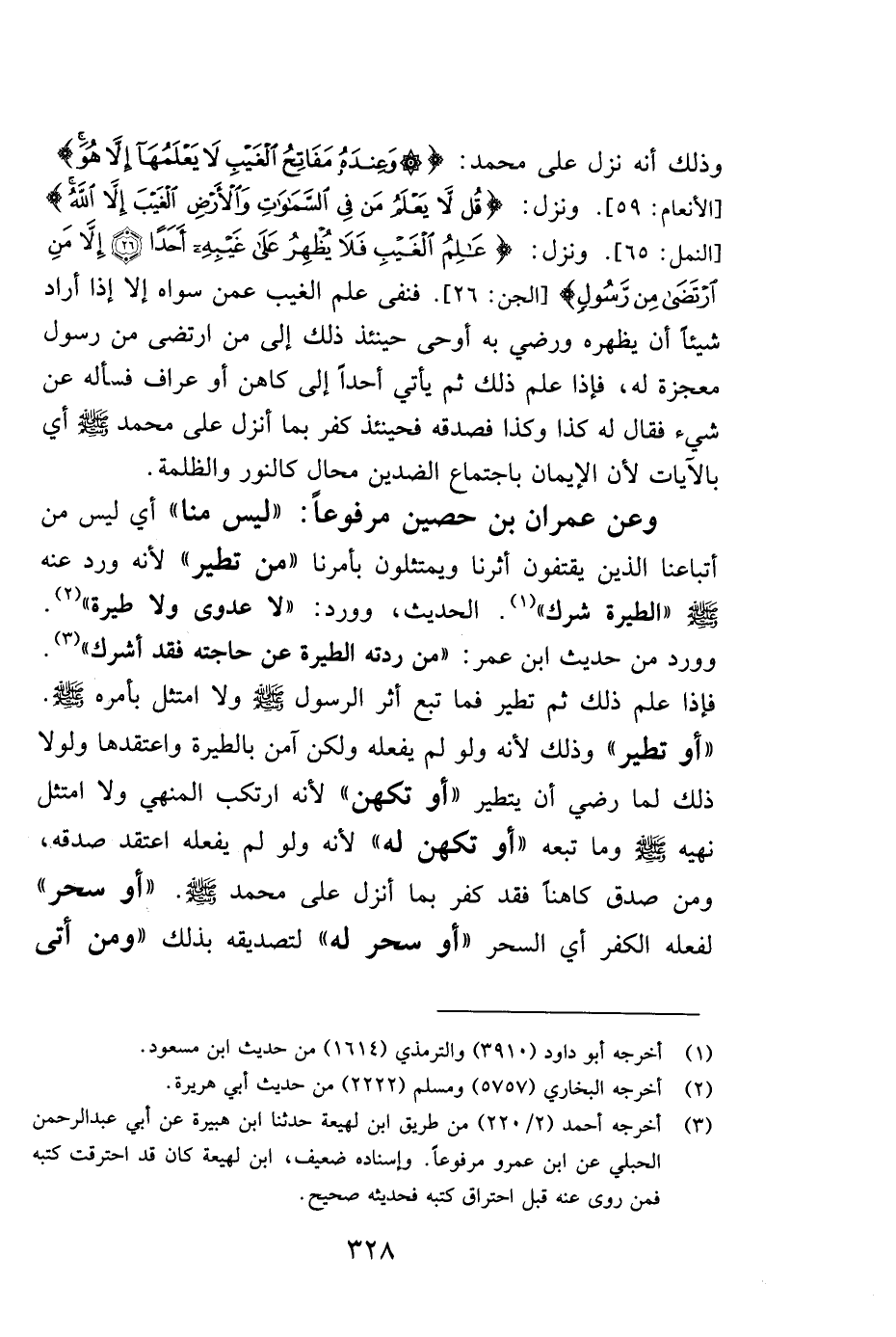 وعن عمران بن حصين مرفوعاً: "ليس منا" أي ليس من اتباعنا الذين يقتفون أثرنا ويمتثلون بأمرنا " من تطير" لأنه ورد عنه صلى الله عليه وسلم "الطيرة شرك" 1. الحديث، وورد: "لا عدوى ولا طيرة" 2. وورد من حديث ابن عمر: "من ردته الطيرة عن حاجته فقد أشرك" 3. فإذا علم ذلك ثم تطير فما تبع أثر الرسول صلى الله عليه وسلم ولا امتثل بأمره صلى الله عليه وسلم. "أو تطير" وذلك لأنه ولو لم يفعله ولكن آمن بالطيرة واعتقدها ولولا ذلك لما رضي أن يتطير " أو تكهن" لأنه ارتكب المنهي ولا امتثل نهيه صلى الله عليه وسلم وما تبعه " أو تكهن له" لأنه ولو لم يفعله اعتقد صدقه، ومن صدق كاهناً فقد كفر بما أنزل على محمد صلى الله عليه وسلم. "أو سحر" لفعله الكفر أي السحر "أو سحر له" لتصديقه بذلك "ومن أتى