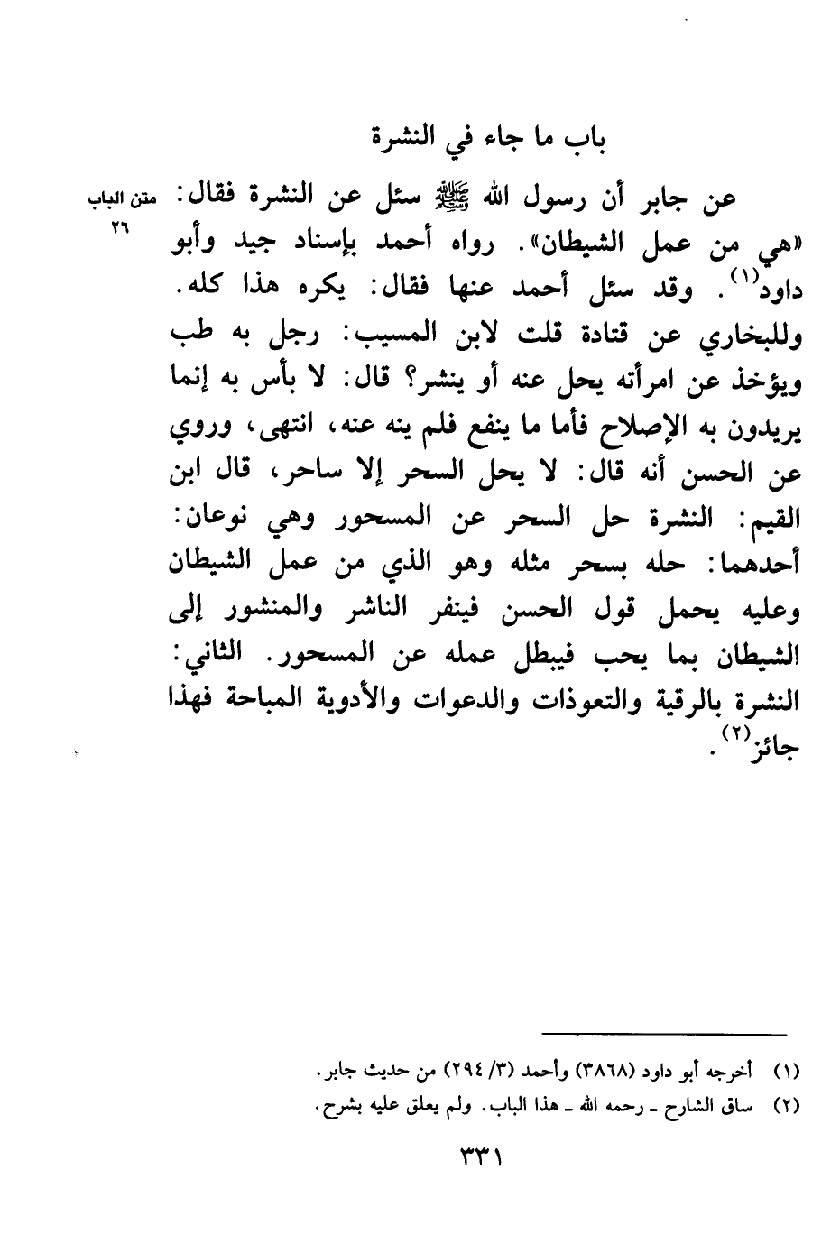 عن جابر رضي الله عنه أن رسول الله صلى الله عليه وسلم سئل عن النشرة فقال: "هي من عمل الشيطان" رواه أحمد بإسناد جيد وأبو داود1. وقد سئل أحمد عنها فقال: يكره هذا كله.