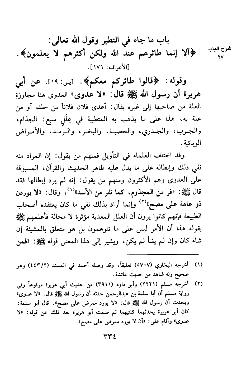 وقوله: {قَالُوا طَائِرُكُمْ مَعَكُمْ} [يس: 19] . عن أبي هريرة أن رسول الله صلى الله عليه وسلم قال: "لا عدوى" العدوى هنا مجاوزة العلة من صاحبها إلى غيره يقال: أعدى فلان فلاناً من حلقه أو من علة به، هذا على ما يذهب به المتطببة في عِلَلِ سبع: الجذام، والجرب، والجدري، والحصبة، والبخر، والرمد، والأمراض الوبائية.