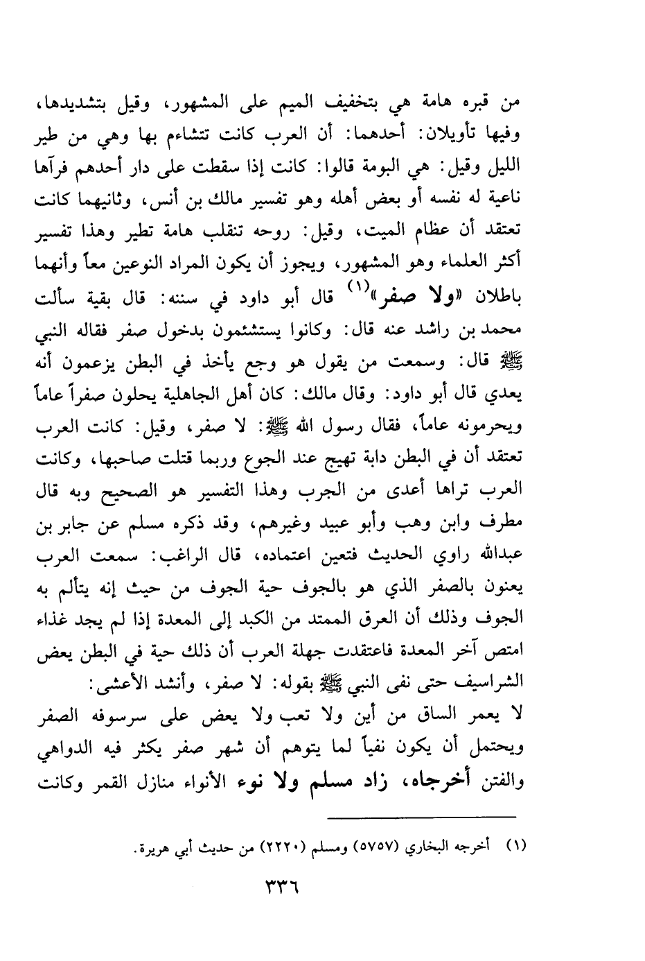 من قبره هامة هي بتخفيف الميم على المشهور، وقيل بتشديدها، وفيها تأويلان: أحدهما: أن العرب كانت تتشاءم بها وهي من طير الليل وقيل: هي البومة قالوا: كانت إذا سقطت على دار أحدهم فرآها ناعية له نفسه أو بعض أهله وهو تفسير مالك بن أنس، وثانيهما: كانت تعتقد أن عظام الميت، وقيل: روحه تنقلب هامة تطير وهذا تفسير أكثر العلماء وهو المشهور، ويجوز أن يكون المراد النوعين معاً وأنهما باطلان، "ولا صفر" 1 قال أبو داود في سننه: قال بقية سألت محمد بن راشد عنه قال: وكانوا يستشئمون بدخول صفر فقاله النبي صلى الله عليه وسلم قال: وسمعت من يقول هو وجع يأخذ في البطن يزعمون أنه يعدي قال أبو داود: وقال مالك: كان أهل الجاهلية يحلون صفر عاماً ويحرمونه عاماً، فقال رسول الله صلى الله عليه وسلم: لا صفر، وقيل: كانت العرب تعتقد أن في البطن دابة تهيج عند الجوع وربما قتلت صاحبها، وكانت العرب تراها أعدى من الجرب وهذا التفسير هو الصحيح وبه قال مطرف وابن وهب وأبو عبيد وغيرهم، وقد ذكره مسلم عن جابر بن عبد الله راوي الحديث فتعين اعتماده، قال الراغب: سمعت العرب يعنون بالصفر الذي هو بالجوف حية الجوف من حيث إنه يتألم به الجوف وذلك أن العرق الممتد من الكبد إلى المعدة إذا لم يجد غذاء امتص آخر المعدة فاعتقدت جهلة العرب أن ذلك حية في البطن يعض الشراسيف حتى نفى النبي صلى الله عليه وسلم بقوله: لا صفر، وأنشد الأعشى:
