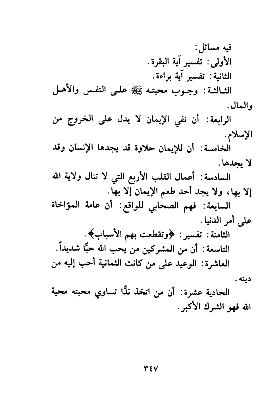 الثالثة: وجوب محبته صلى الله عليه وسلم على النفس والأهل والمال.