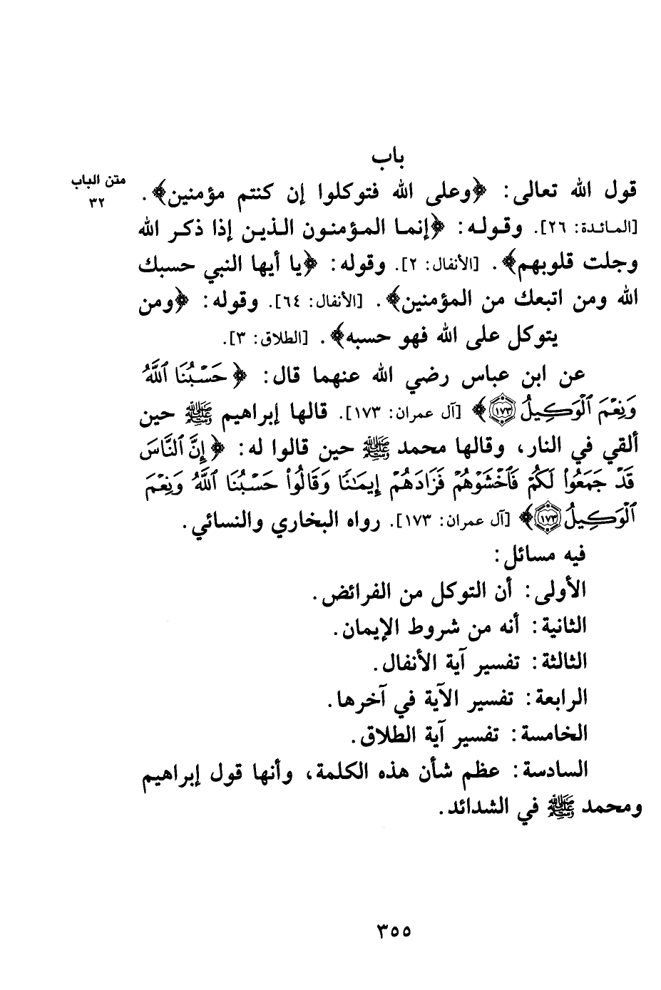 باب قول الله تعالى: {وَعَلَى اللَّهِ فَتَوَكَّلُوا إِنْ كُنْتُمْ مُؤْمِنِينَ} [المائدة: 26] . وقوله: {إِنَّمَا الْمُؤْمِنُونَ الَّذِينَ إِذَا ذُكِرَ اللَّهُ وَجِلَتْ قُلُوبُهُمْ} [الأنفال: 2] . وقوله {يَا أَيُّهَا النَّبِيُّ حَسْبُكَ اللَّهُ وَمَنِ اتَّبَعَكَ مِنَ الْمُؤْمِنِينَ} [الأنفال: 64] . وقوله: {وَمَنْ يَتَوَكَّلْ عَلَى اللَّهِ فَهُوَ حَسْبُهُ} [الطلاق: 3] .