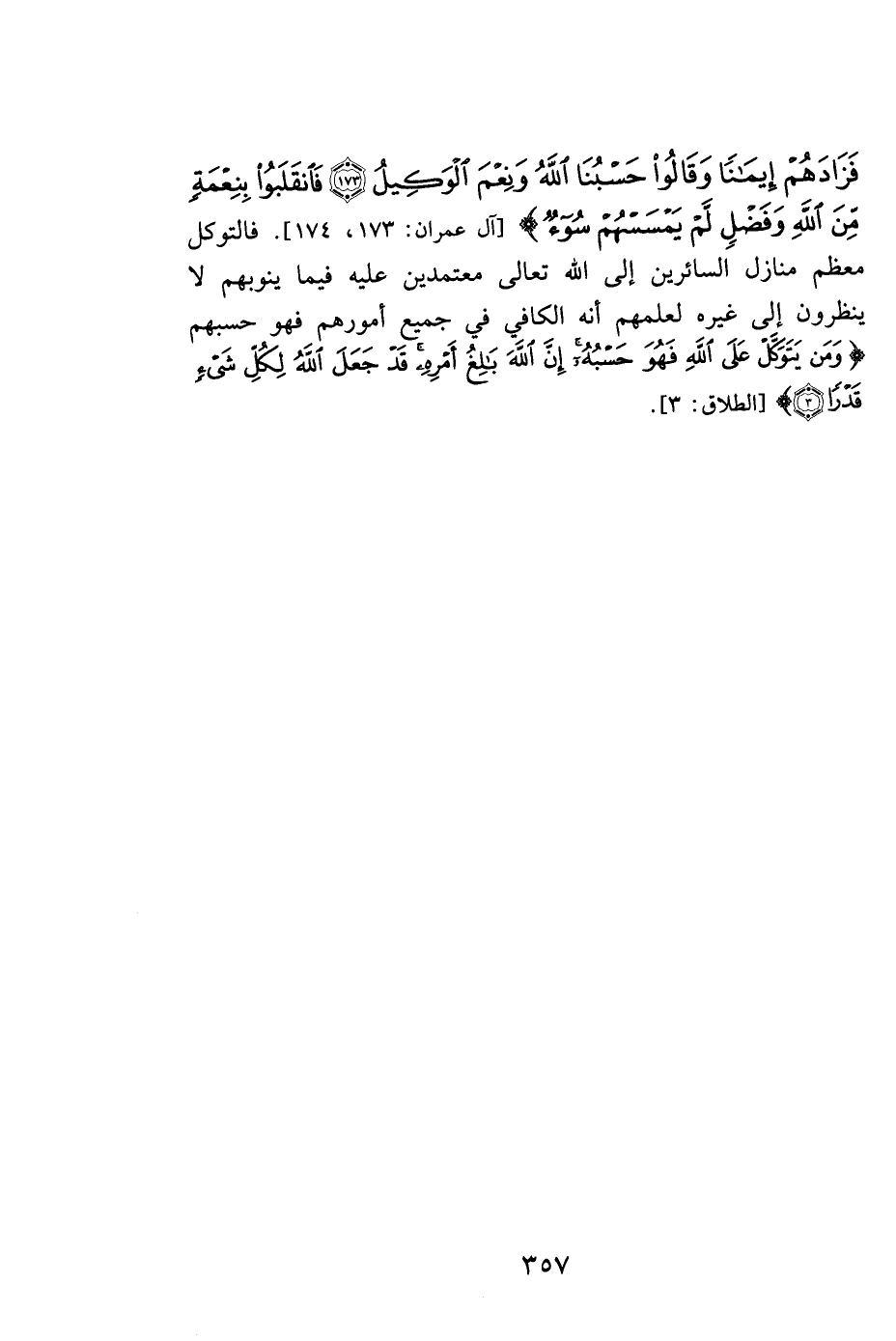 فَزَادَهُمْ إِيمَاناً وَقَالُوا حَسْبُنَا اللَّهُ وَنِعْمَ الْوَكِيلُ فَانْقَلَبُوا بِنِعْمَةٍ مِنَ اللَّهِ وَفَضْلٍ لَمْ يَمْسَسْهُمْ سُوءٌ} [آل عمران: 173، 174] . فالتوكل معظم منازل السائرين إلى الله تعالى معتمدين عليه فيما ينوبهم لا ينظرون إلى غيره لعلمهم أنه الكافي في جميع أمروهم فهو حسبهم {وَمَنْ يَتَوَكَّلْ عَلَى اللَّهِ فَهُوَ حَسْبُهُ إِنَّ اللَّهَ بَالِغُ أَمْرِهِ قَدْ جَعَلَ اللَّهُ لِكُلِّ شَيْءٍ قَدْراً} [الطلاق: 3] .