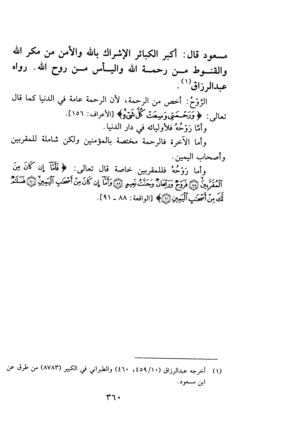 مسعود قال: أكبر الكبائر الإشراك بالله والأمن من مكر الله والقنوط من رحمة الله واليأس من روح الله" رواه عبد الرزاق1.