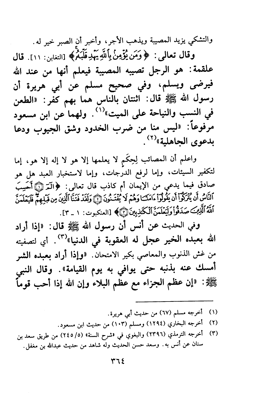 وقول الله تعالى: {وَمَنْ يُؤْمِنْ بِاللَّهِ يَهْدِ قَلْبَهُ} [التغابن: 11] قال علقمة: هو الرجل تصيبه المصيبة فيعلم أنها من عند الله فيرضى ويسلم، وفي صحيح مسلم عن أبي هريرة أن رسول الله صلى الله عليه وسلم قال: "اثنتان بالناس هما بهم كفر: الطعن في النسب والنياحة على الميت" 1. ولهما عن ابن مسعود مرفوعاً: "ليس منا من ضرب الخدود وشق الجيوب ودعا بدعوى الجاهلية" 2.