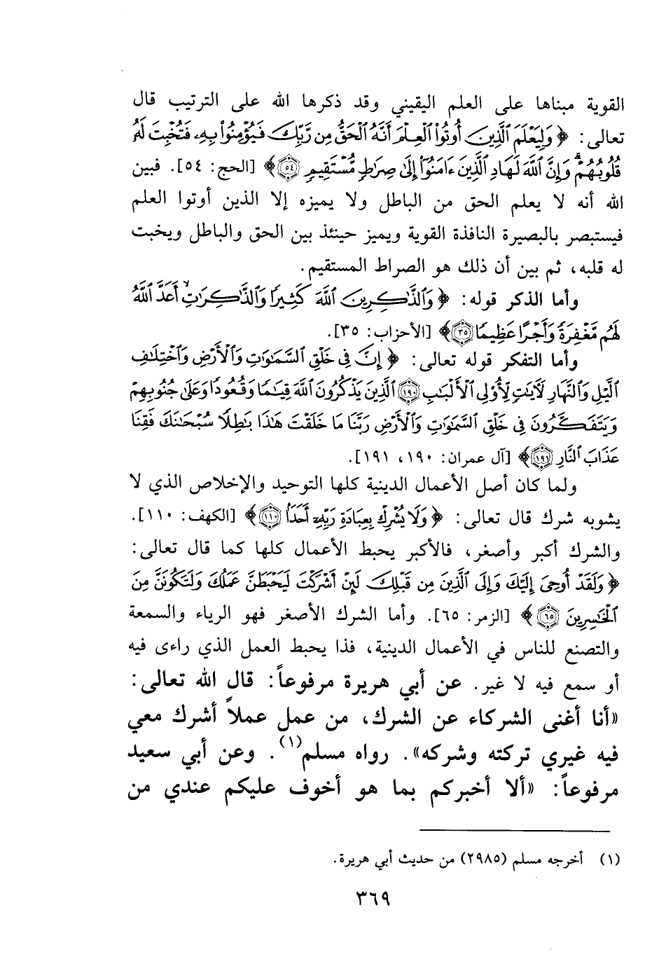 ولما كان أصل الأعمال الدينية كلها التوحيد والإخلاص الذي لا يشوبه شرك قال تعالى: {وَلا يُشْرِكْ بِعِبَادَةِ رَبِّهِ أَحَداً} . [الكهف: 110] . والشرك أكبر وأصغر، فالأكبر يحبط الأعمال كلها كما قال تعالى: {وَلَقَدْ أُوحِيَ إِلَيْكَ وَإِلَى الَّذِينَ مِنْ قَبْلِكَ لَئِنْ أَشْرَكْتَ لَيَحْبَطَنَّ عَمَلُكَ وَلَتَكُونَنَّ مِنَ الْخَاسِرِينَ} . [الزمر: 65] . وأما الشرك الأصغر فهو الرياء والسمعة والتصنع للناس في الأعمال الدينية، فذا يحبط العمل الذي راءى فيه أو سمع فيه لا غير. عن أبي هريرة مرفوعاً: قال الله تعالى: "أنا أغنى الشركاء عن الشرك، من عمل عملاً أشرك معي فيه غيري تركته وشركه". رواه مسلم1. وعن أبي سعيد مرفوعاً: "ألا أخبركم بما هو أخوف عليكم عندي من