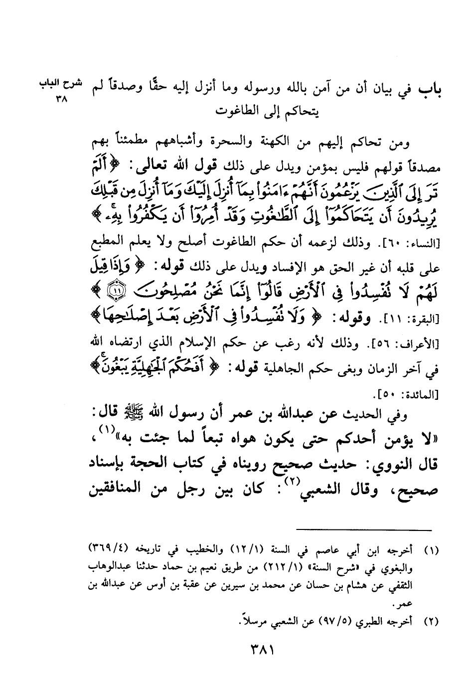 باب في بيان أن من آمن بالله ورسوله وما أنزل إليه حقًّا وصدقاً لم يتحاكم إلى الطاغوت